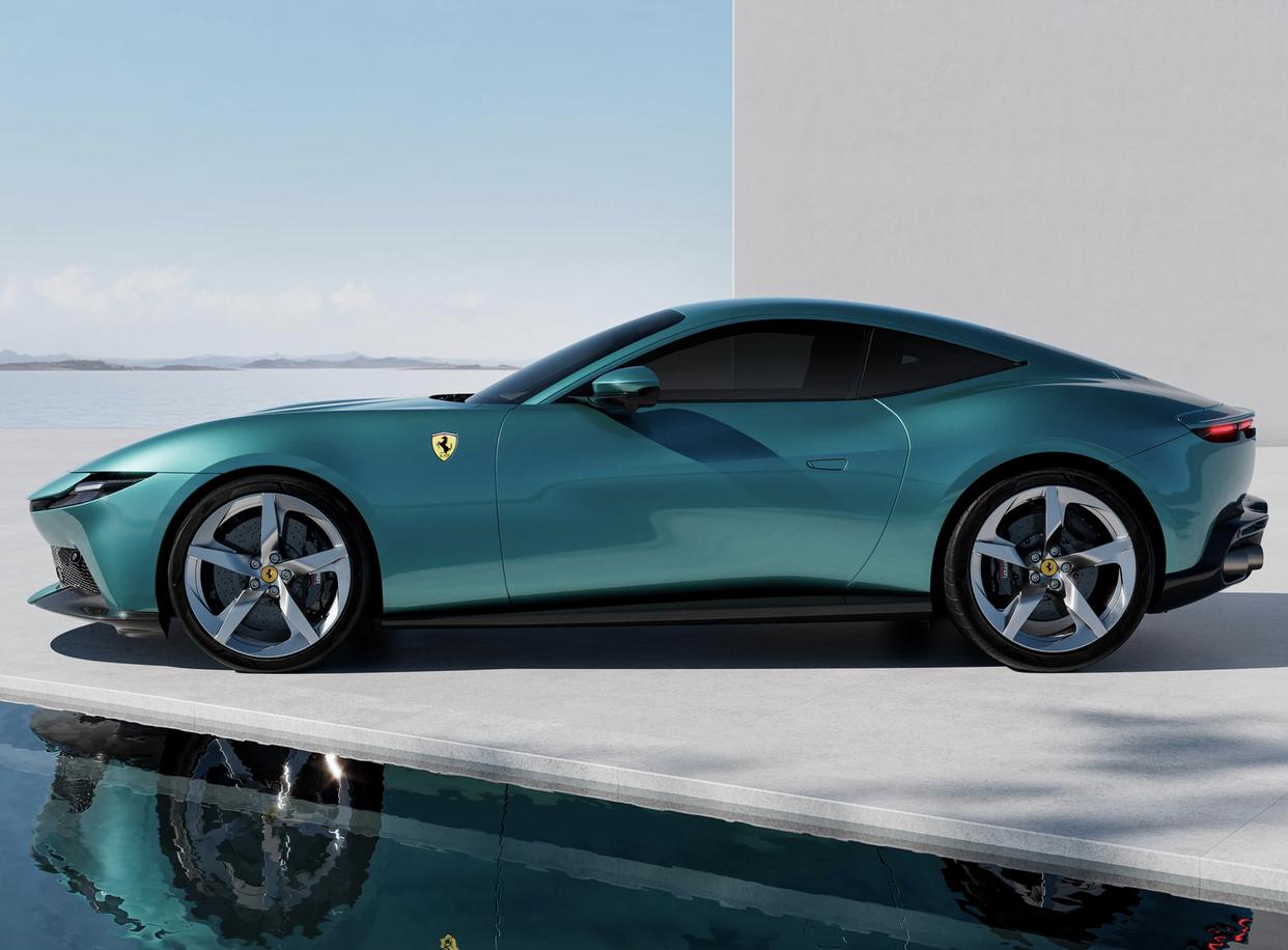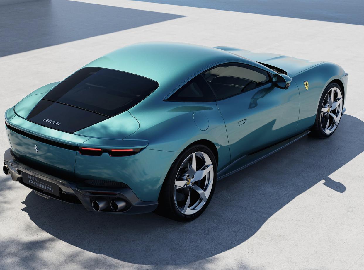 来到车身侧面,法拉利Amalfi采用了修车的车头与后移的座舱,使车长与车高的比例达到1:2的完美黄金比例。隐藏式的门把手、两侧无边框车门以及法拉利标志性的五辐式锻造轮毂,宽体碳纤维侧裙,也为整车造型增添一抹动感气息与精致美感。此外,新车还配备专属Verde Costiera蓝绿色车漆,灵感源于Amalfi海岸的粼粼波光。法拉利Amalfi是一款硬顶跑车,后续还将推出敞篷版车型。尺寸方面,该车的长宽高为4660/1974/1301mm,轴距为2670mm,是一款极具代表性的2+2式硬顶GT跑车,后排座椅可扩展储物空间,并支持儿童安全座椅安装。