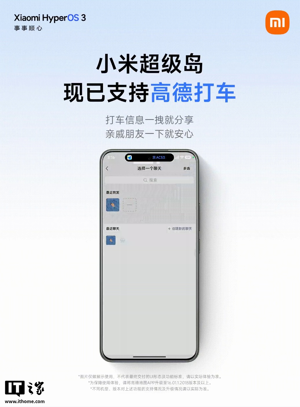 小米澎湃OS“超级岛”支持高德打车,不打开App可查车牌号等信息