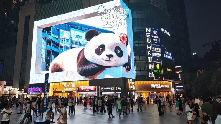 国庆中秋期间,观音桥商圈与春熙路大屏联动,通过成都太古里标志性大熊猫形象融入重庆特色山茶花元素,“现身”成渝两地标志性大屏。以趣味视觉语言打破城市界限,强化“成渝一家亲”情感归属。