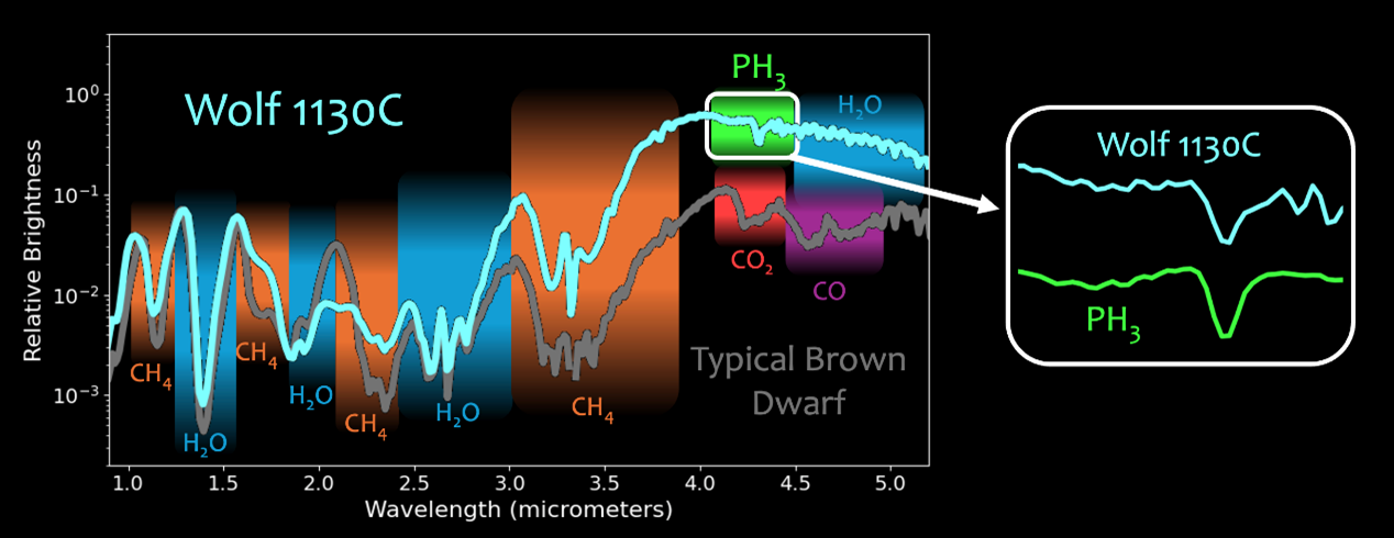 亚当·伯加瑟教授表示,团队通过分析韦伯望远镜传回的高精度红外光谱数据,在Wolf 1130 C的大气中发现了磷化氢独有的吸收特征。通过先进的大气反演模型,他们确定磷化氢在这颗褐矮星大气中的丰度约为千万分之一。
