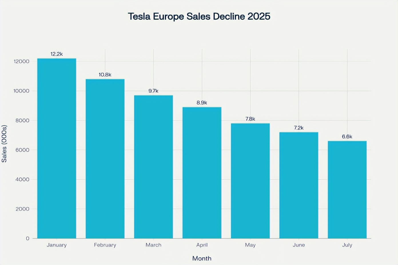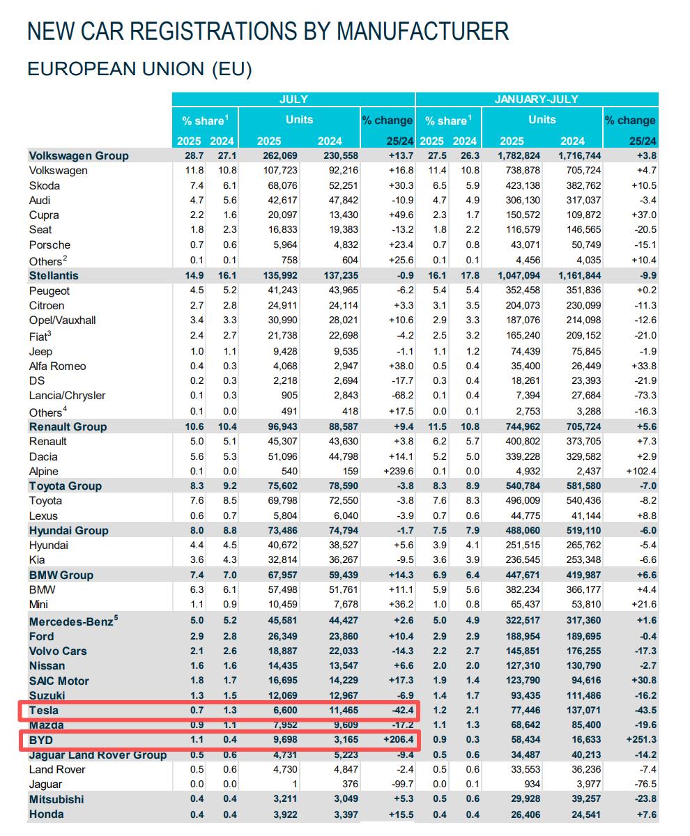 根据 ACEA (欧洲汽车制造商协会)的数据,在今年 7 月份,特斯拉销量同比下跌了 42.4%,在欧盟这个 4.5 亿人口市场,它只卖了 6600 台。