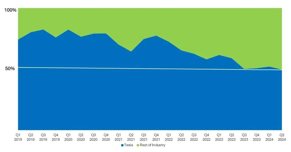 但要知道,这是在美国,新能源市场不仅盘子小,能选的车也不多,特斯拉在过去几乎就是垄断的存在,市占率一度高达 80% 。