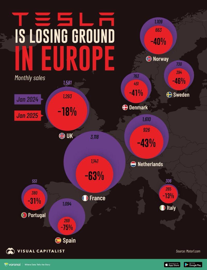 与此同时,特斯拉在世界各地其实都没好到哪里去。