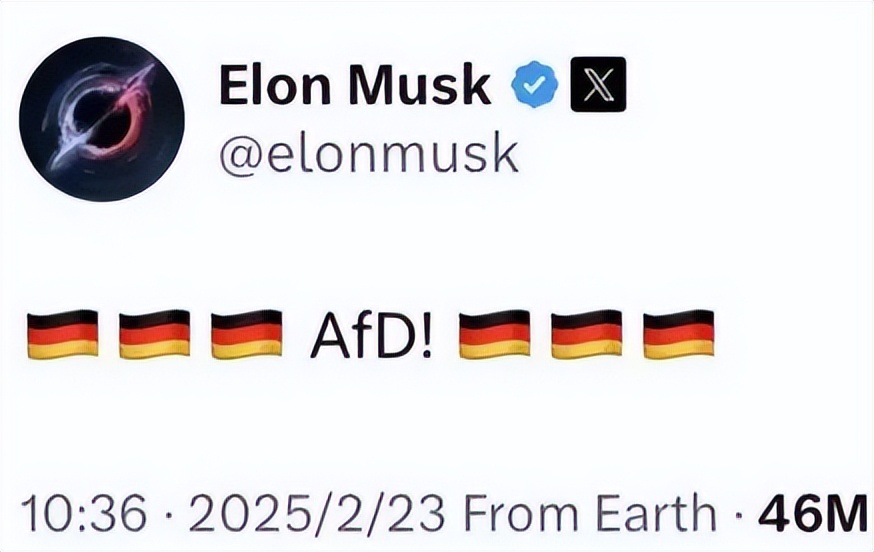 比如最近,马斯克就直接连线英国伦敦的抗议活动,呼吁群众 “ 挺身而出 ” 。之前的德国大选,老马也公开在 X 上指手画脚,不管对手还是友军,都有点看不下去了。