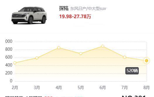 最后,再来看一下销量,探陆的8月销量仅为520台,今年销量最高的时候,月销量也仅为887台。按理说,这款车的价格已经很低了,而且产品力也不错,还有日产所赋予的品牌光环,为何会卖不动呢?