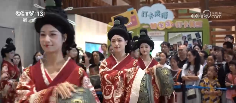 国庆假期,成都博物馆推出秦汉乐舞展演,优雅的舞姿与悠扬的古乐相得益彰,为观众带来一场视觉与听觉的双重盛宴。在博物馆内一项项新潮有趣的打卡体验,将流行文化融入文博场景,让游客在沉浸式的互动中,感受文物“活”起来的魅力。