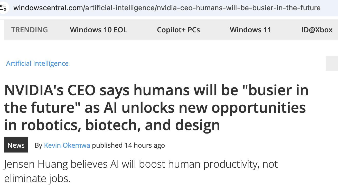 【环球网科技综合报道】10月4日消息,据外媒windowscentral报道,针对生成式人工智能(AI)可能引发大规模失业的担忧,NVIDIA首席执行官黄仁勋本周再度发声,强调AI“不会取代人类,而是让人类更忙碌”。他预计,机器人、生物技术与设计等前沿行业将在AI推动下诞生大量新岗位,人类创造力与判断力反而比以往任何时候都更不可或缺。