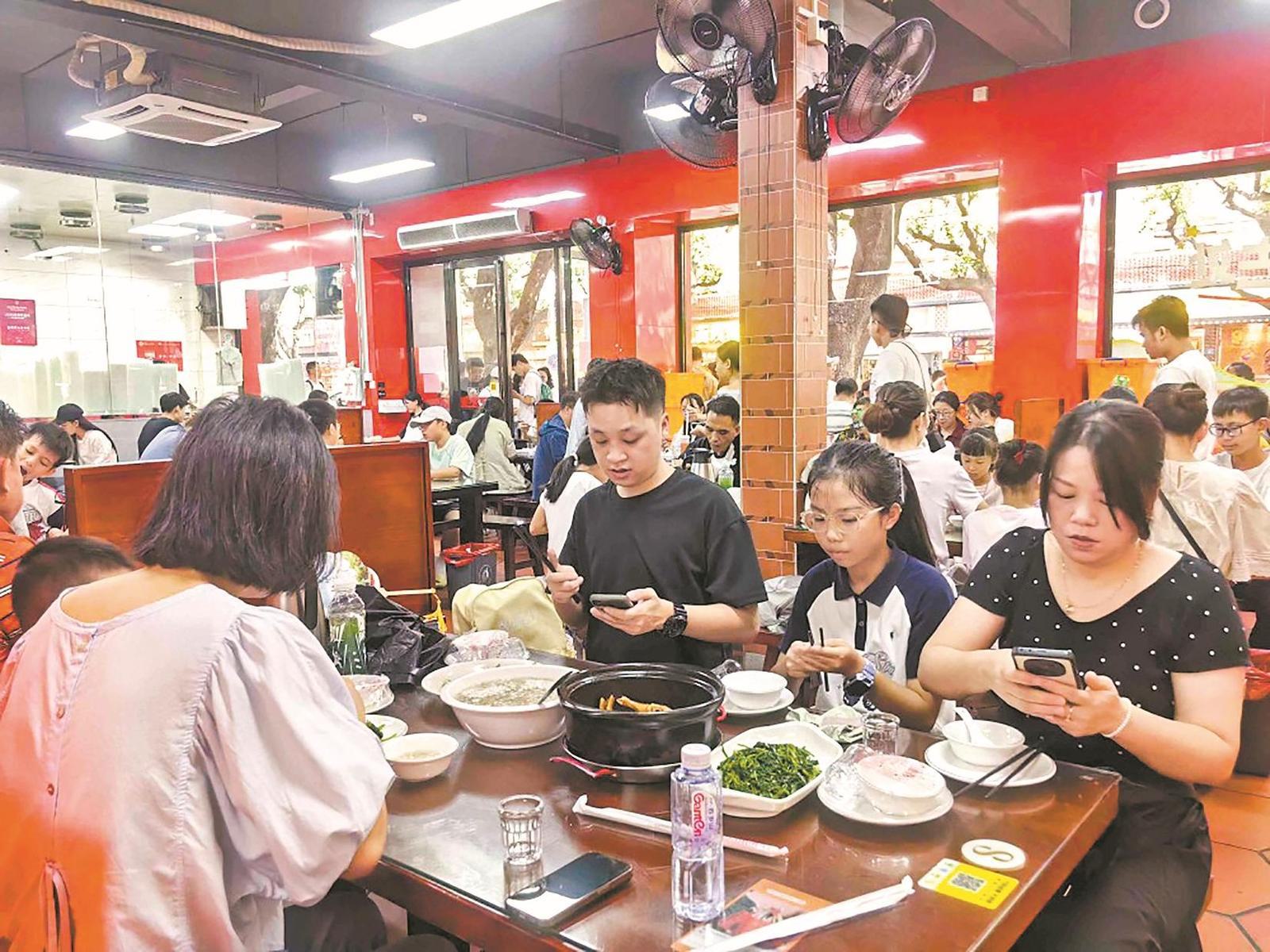 中午时分,涂门街一家牛排馆内同样座无虚席。“终于带儿子吃上他心心念念的这家店了,牛排卤得非常入味,肉质软烂又不失嚼劲,汤汁浓郁特别下饭。”来自温州的黄先生笑着说。他13岁的小儿子早在电视上看过这家店牛排的制作过程,十分向往。趁着国庆假期,他们一家四口专程前来打卡。“实在太好吃了,我们打算继续探索,把其他还没尝过的美食也吃个遍。”