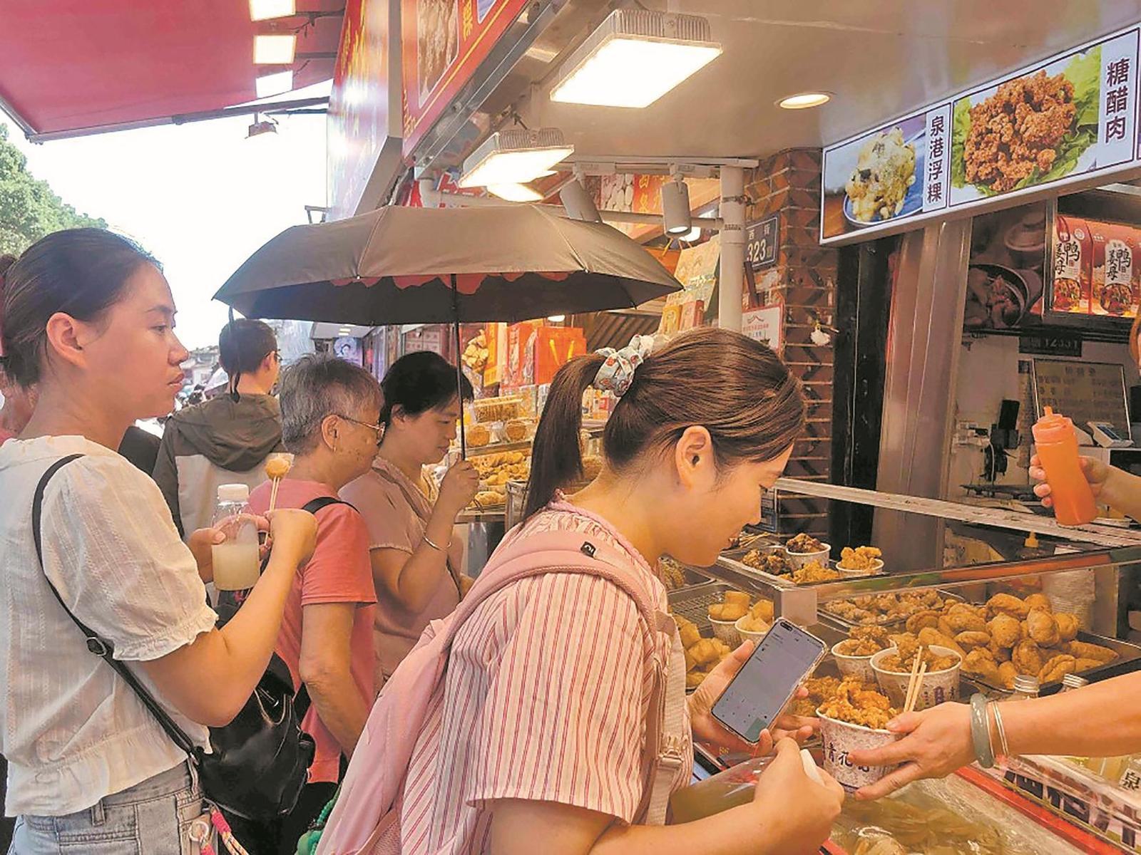 “老板,来份海蛎煎!”“土笋冻也来一份……”上午10点,西街与中山路上已是熙熙攘攘,不少游客携家带口边逛边吃。海蛎煎、土笋冻、芋头饼、浮粿、四果汤……这里汇聚了众多泉州本土小吃,每家店门前都围着不少游客,迎面走来的游客手中也大多拿着茶饮或小吃。“这个芋头饼太好吃了,你们快尝尝!”来自广州的李女士咬了一口刚出锅的芋头饼,就被外酥里嫩的口感惊艳到,立刻与家人分享。还没细细品味完,她的目光又被隔壁的四果汤吸引了过去。