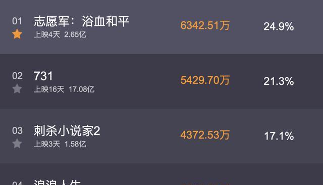 截至发稿时,《志愿军3》(也称《志愿军:浴血和平》)票房揽获2.65亿,《刺杀小说家2》票房拿到了1.58亿,而《浪浪人生》的票房也收获了1.17亿。有意思的是,电影《731》后劲持续上升,票房吸金力增强。
