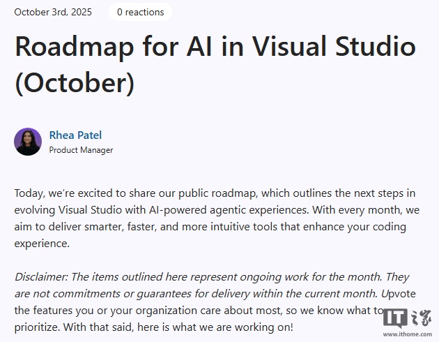 微软公布10月Visual Studio AI发展路线图,多项功能待改进