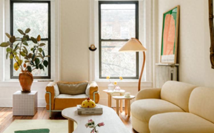 奶茶色本身接近大地色,低饱和度的奶黄色沙发,给人温暖舒缓的感觉。搭配造型圆润的茶几,又不失软萌可爱之感。
