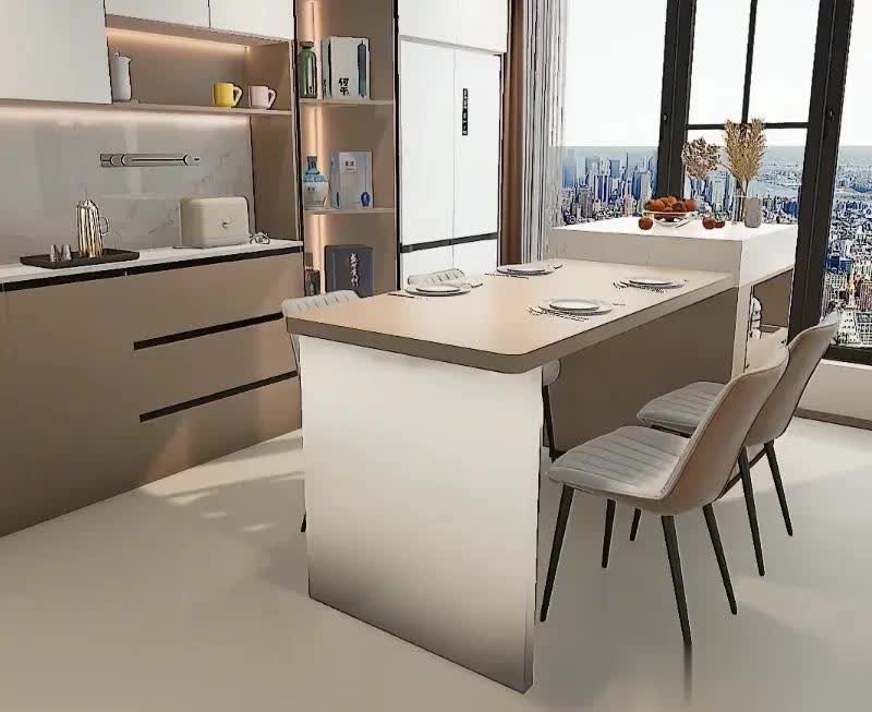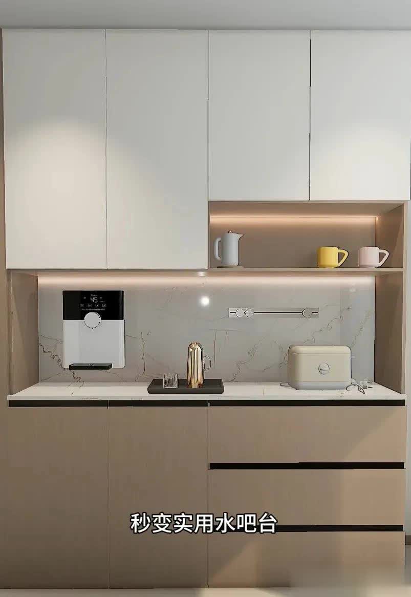 最关键的是中间留了空,装了轨道插座 —— 早上冲咖啡、晚上泡花茶,直接把水壶、咖啡机放这,不用来回跑厨房;朋友来做客时,这里还能当临时 “小吧台”,摆上酒杯超有氛围,实用度直接拉满!