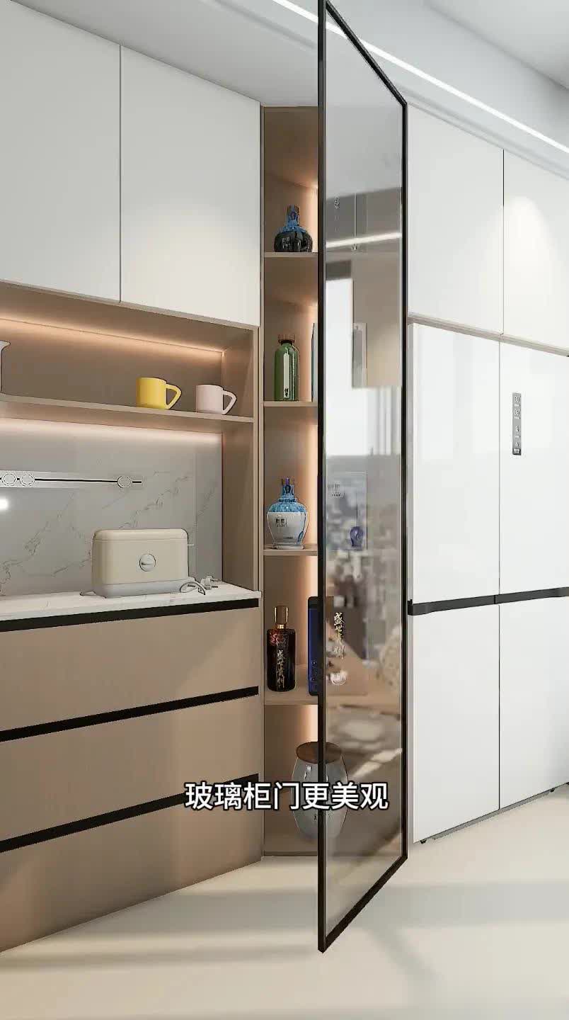 建议选和橱柜同色系的高柜,整体感更强;玻璃柜门选长虹玻璃,透光不透视,藏在里面的餐具、酒水若隐若现,高级感立马就有了。
