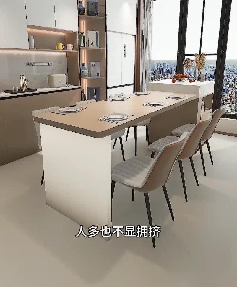 以前买的成品餐桌,平时放着占地方,来客了又不够坐,特别尴尬。现在换了 “嵌入抽拉餐桌”,完美解决这个问题: