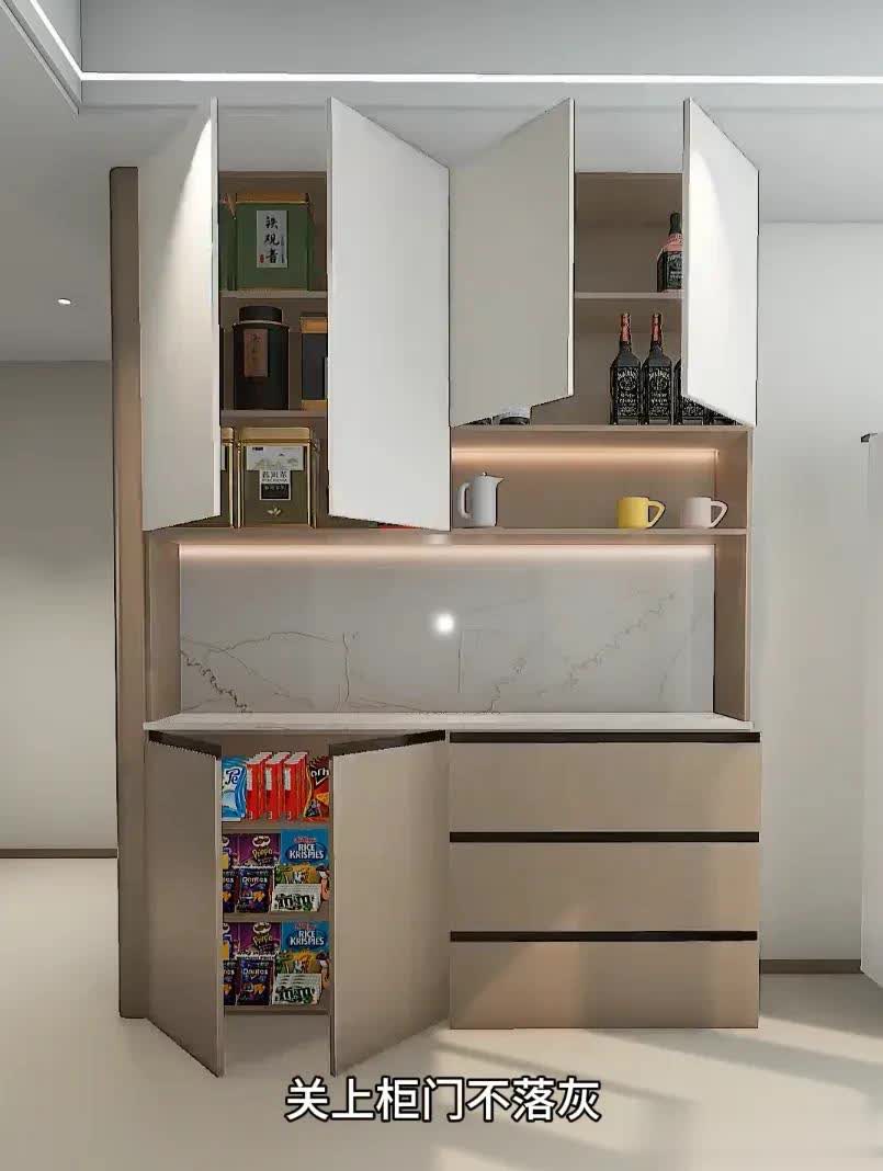 以前餐边柜就是个普通柜子,零食、酒水、杯子全堆一起,找东西要翻半天,敞着门还落灰。后来重新做餐边柜时,特意选了 “上下分仓” 设计: