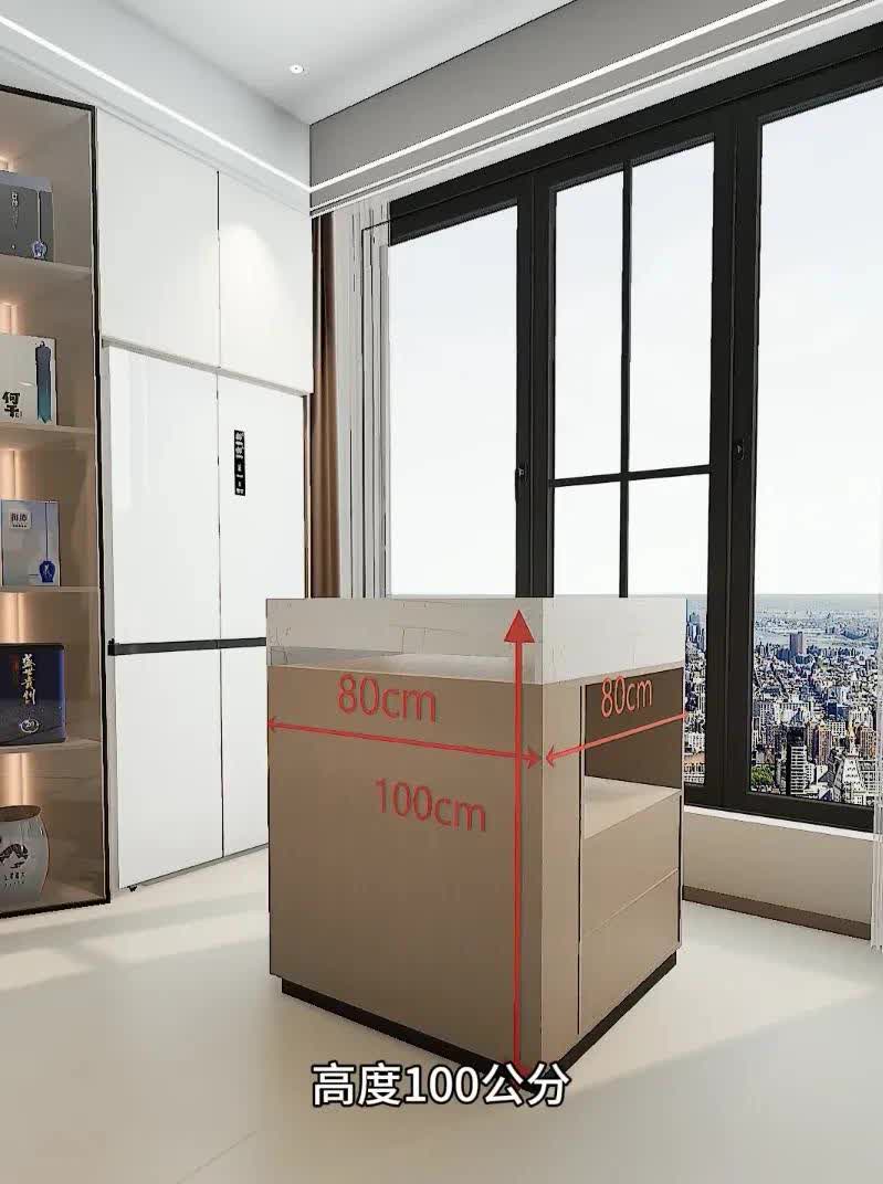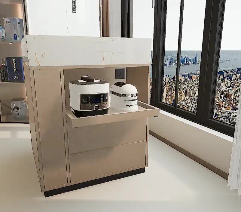 之前电饭煲、电煮锅总堆在厨房台面上,拿取不方便,还挤占做饭空间。后来在餐厅角落定制了一个小倒台,尺寸特意选了宽度 80 公分、高度 100 公分—— 这个尺寸不占太多空间,站着操作也不用弯腰,对老人很友好。