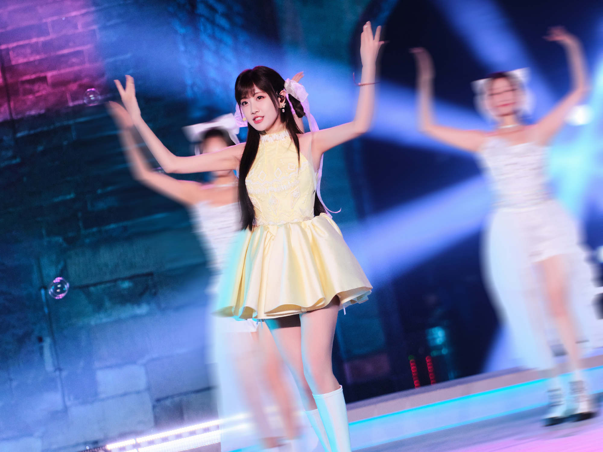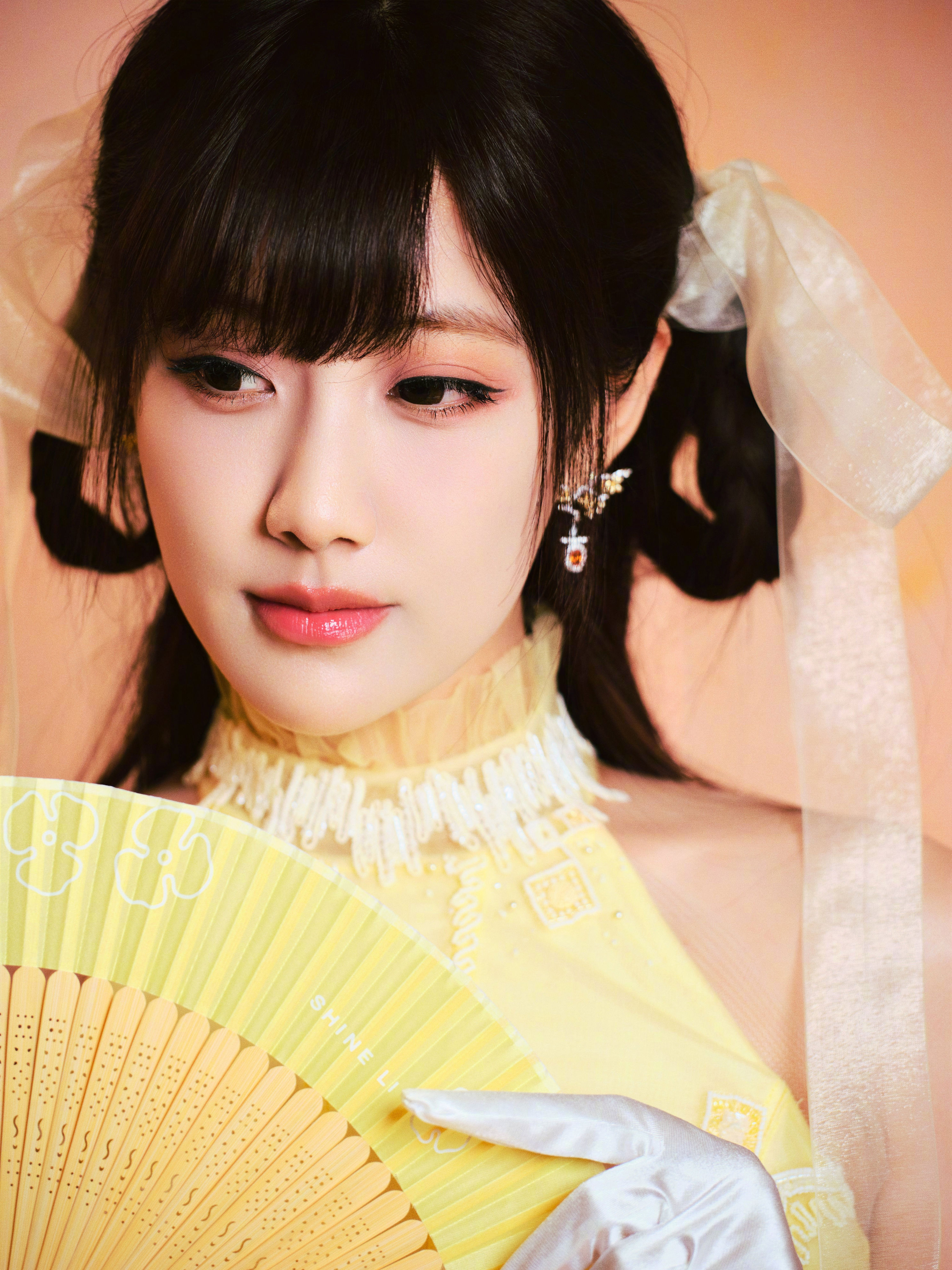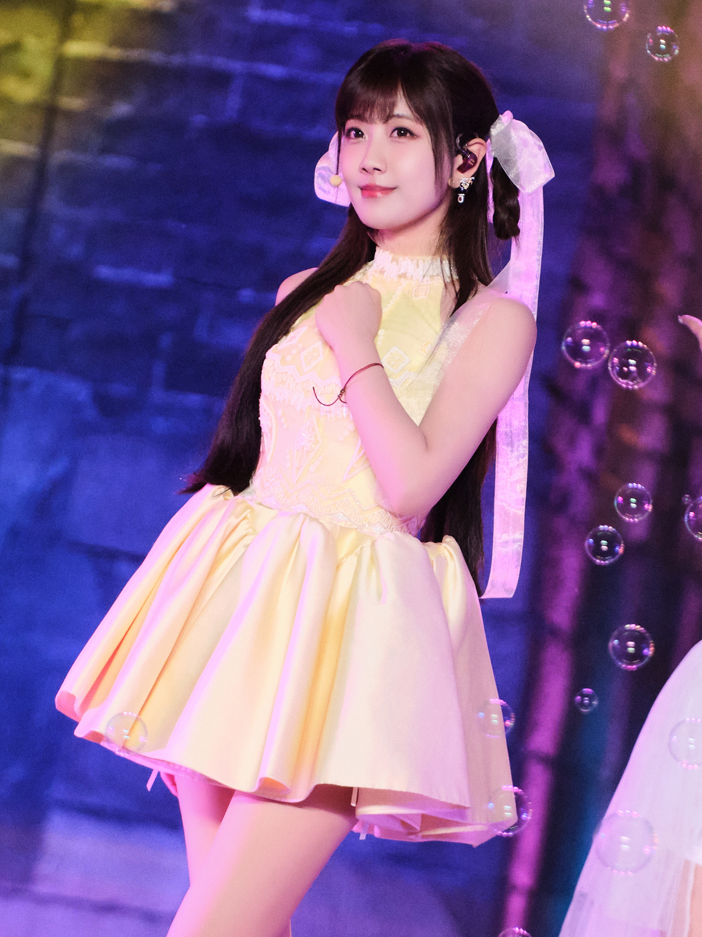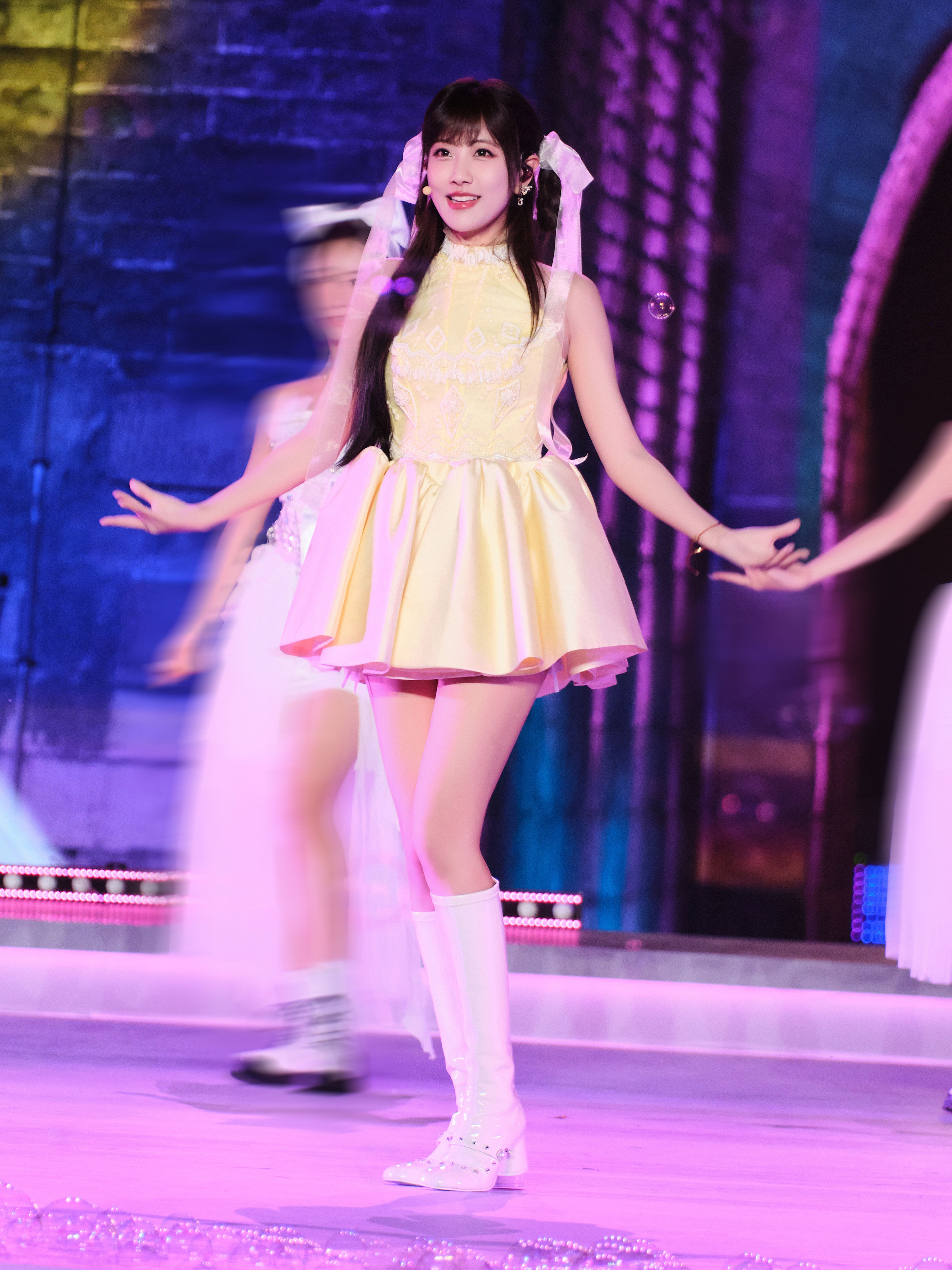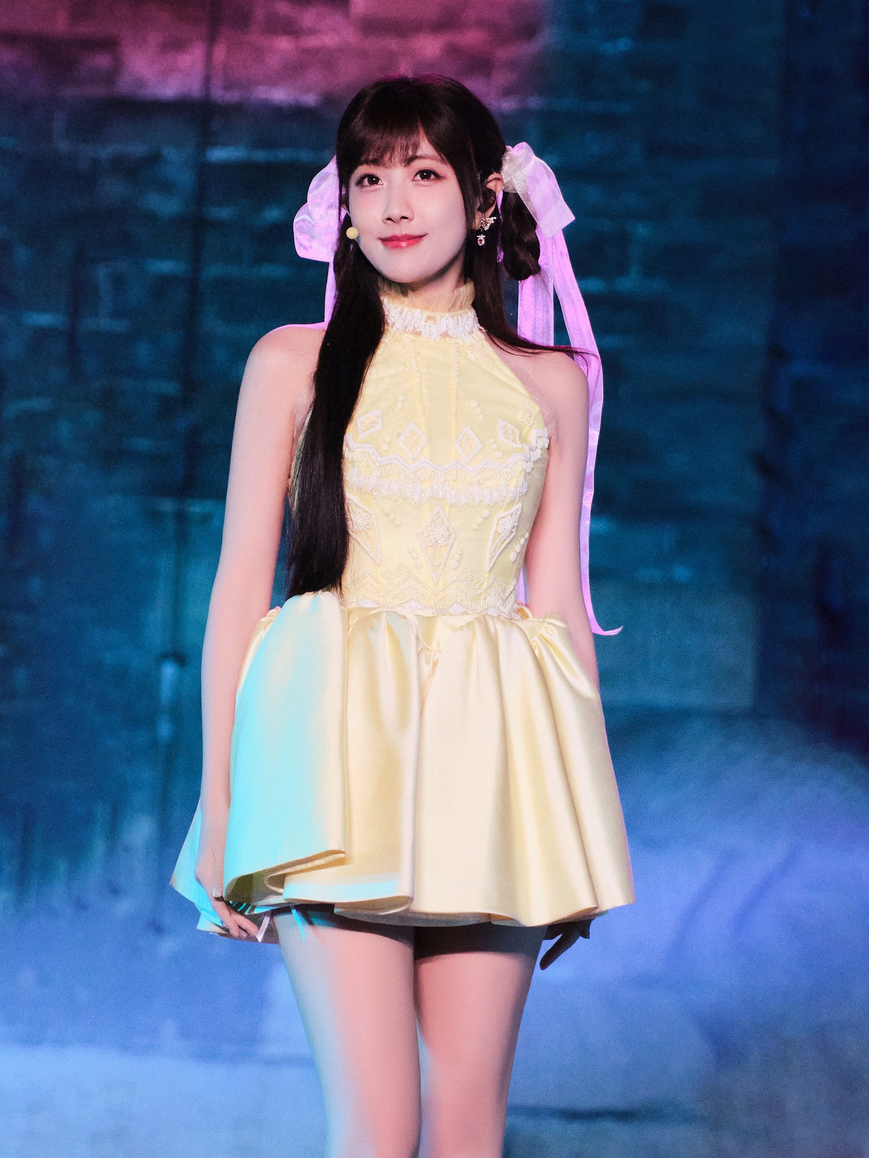 李艺彤 奶黄色缎面连衣裙宛如打翻的蜂蜜罐,高领蕾丝拼接设计糅合复古与甜美元素,裙摆的蓬度恰好营造出公主般的梦幻感。 双马尾搭配超大号透纱蝴蝶结,丝带随动作轻扬,是少女心的具象化表达;白色过膝靴缀以