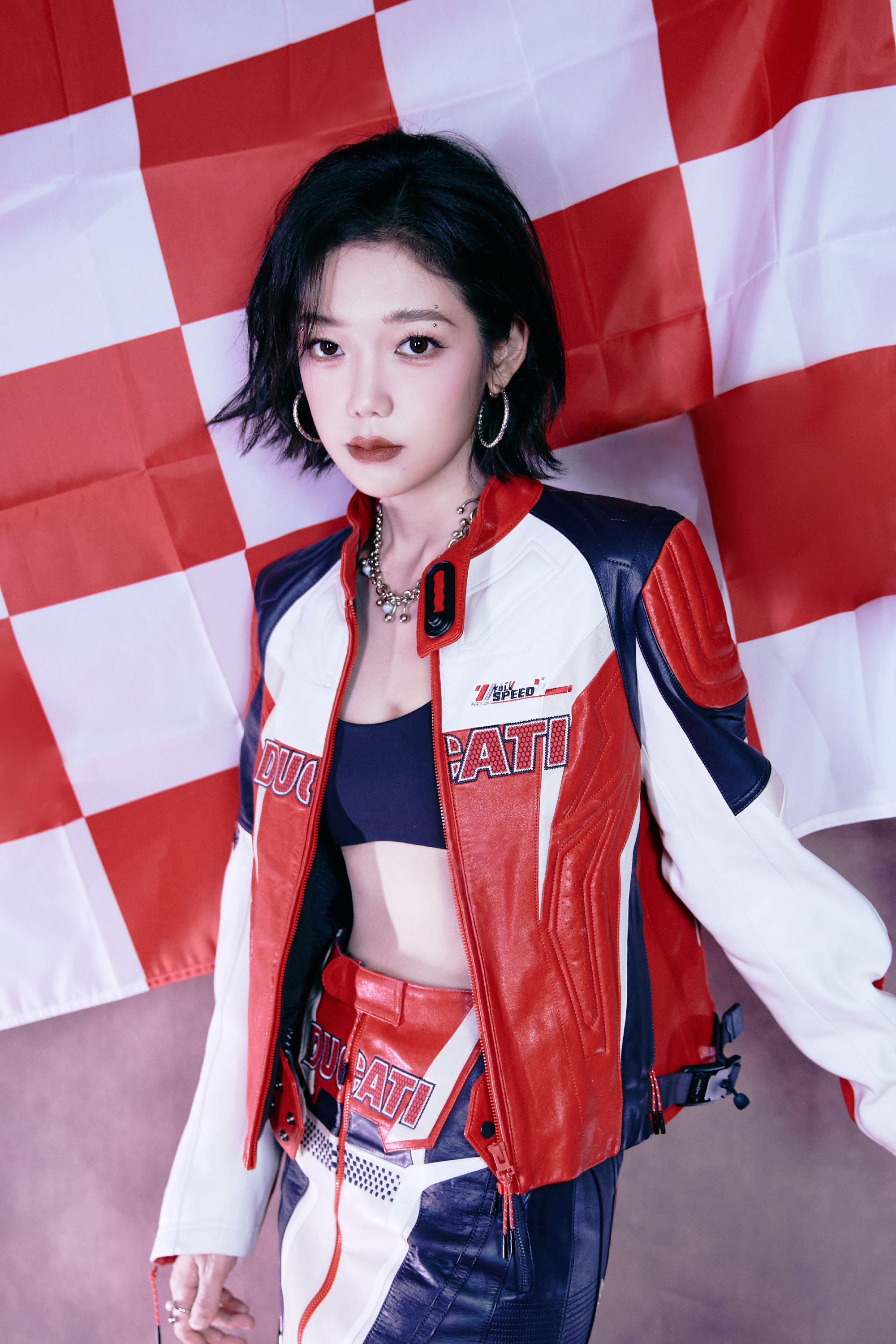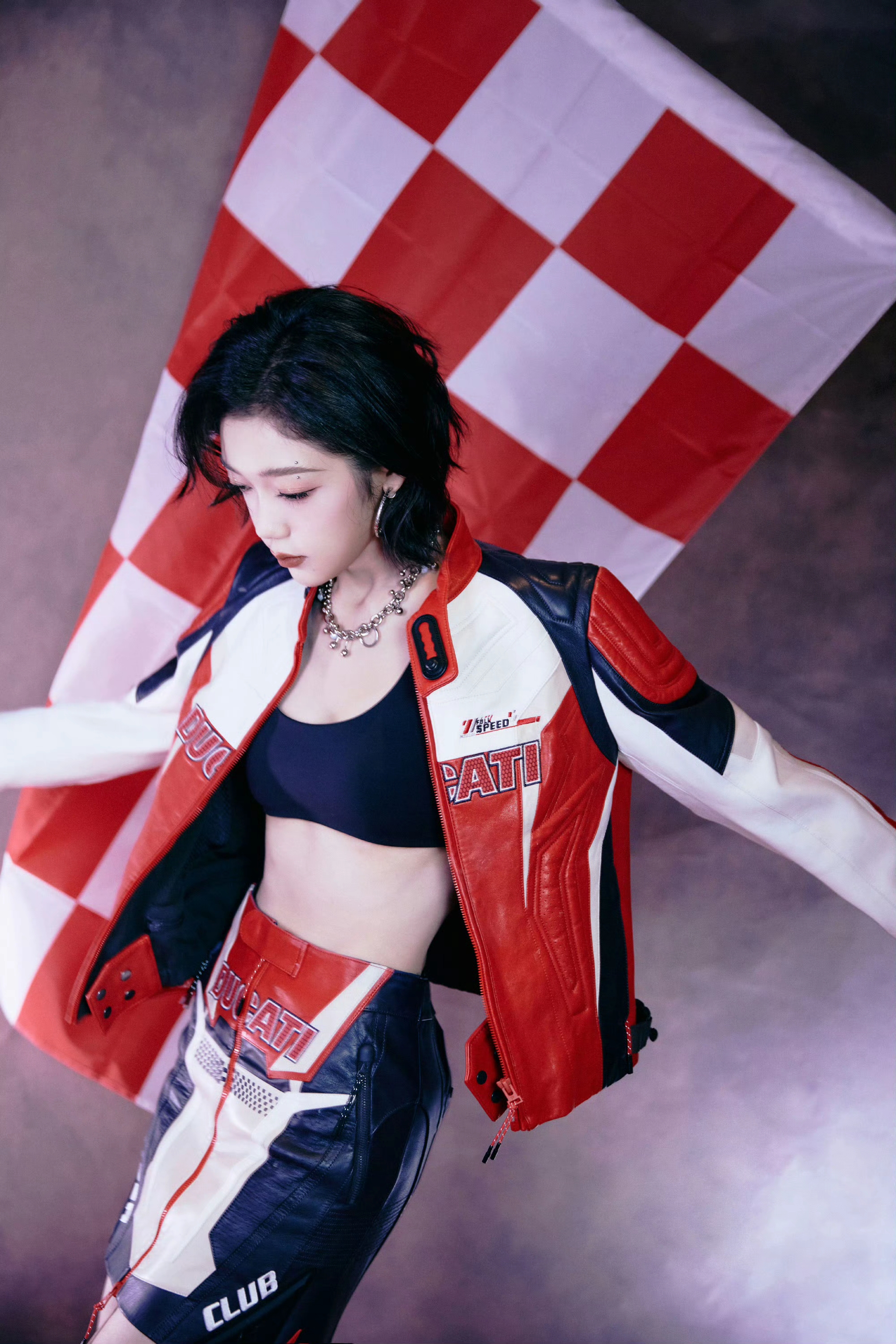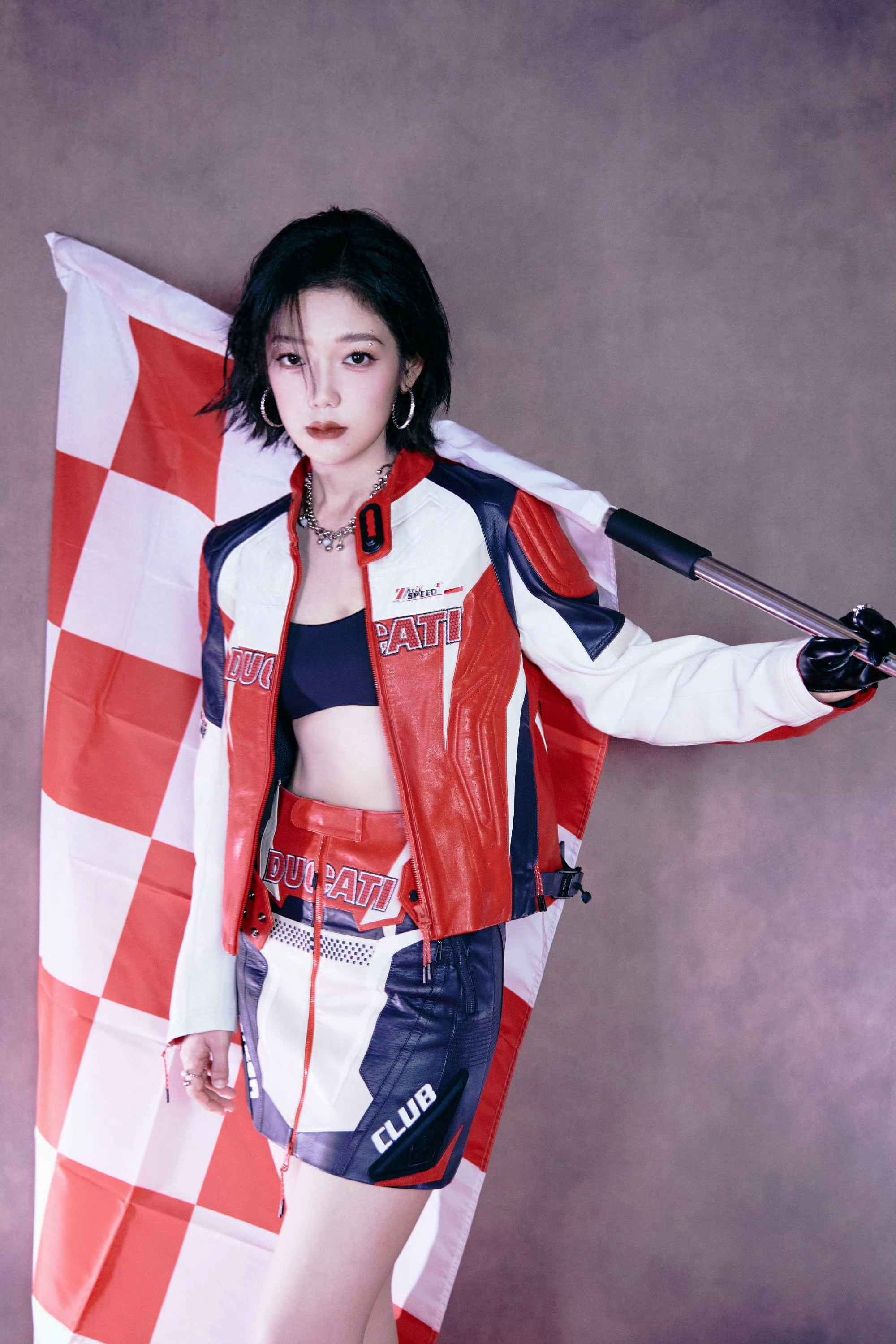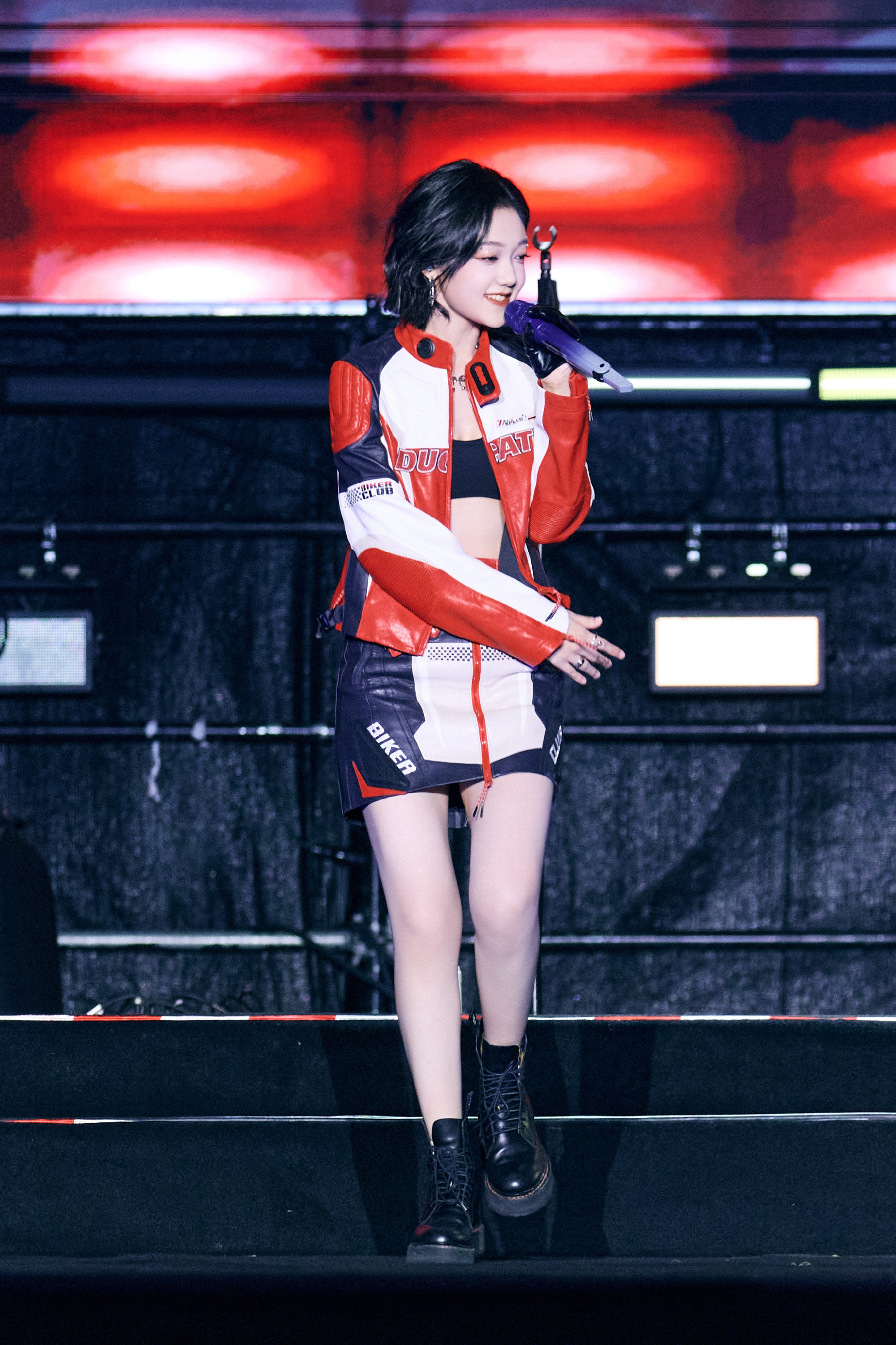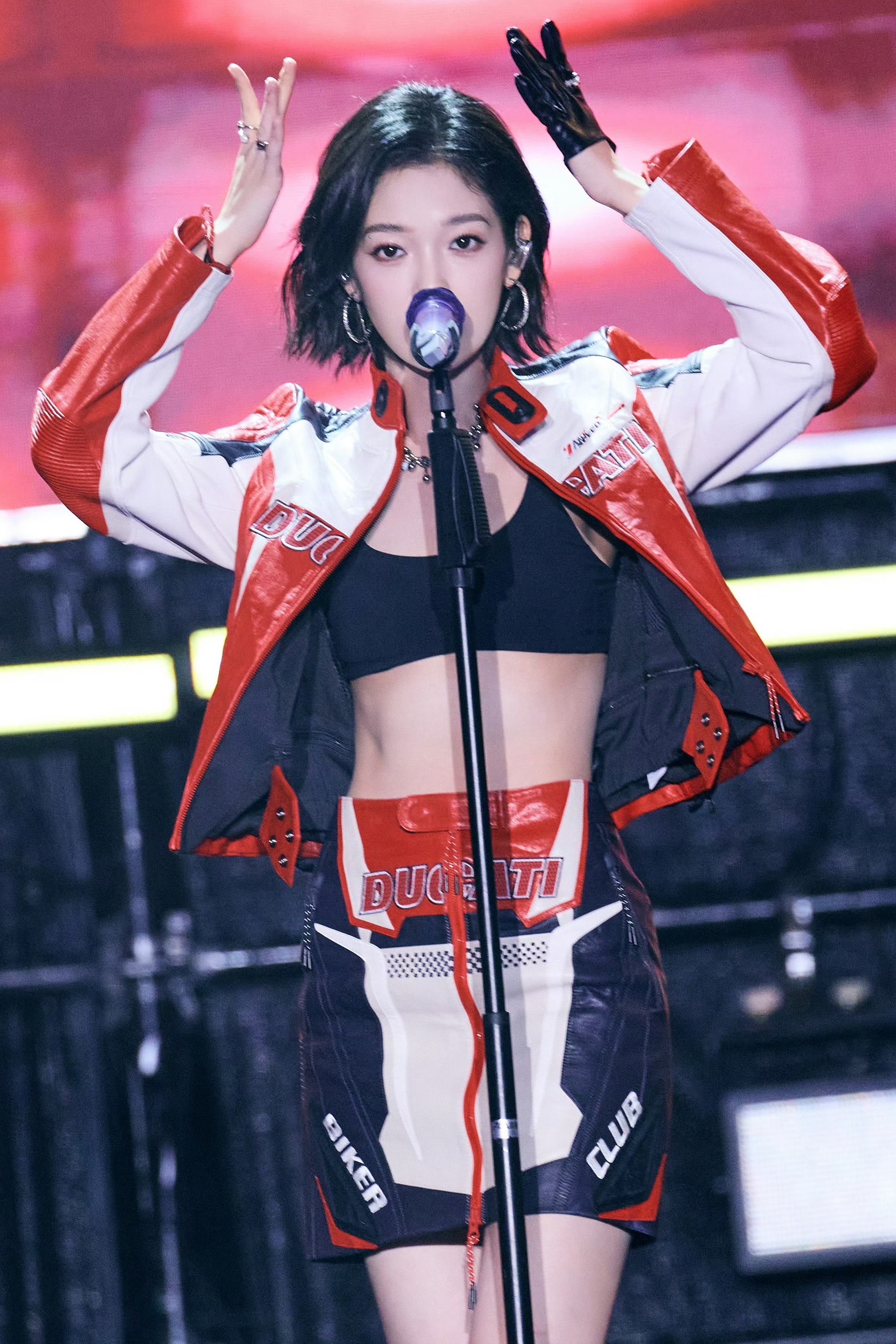希林娜依高 红白黑撞色机车皮套装,以金属扣与品牌标识注入赛道基因,内搭运动bra露腰设计又添性感张力;金属链饰与厚底靴的加持,让每一步都踩在“酷飒与时尚”的平衡点上。 从棚拍镜头到live舞台,这套穿搭是
