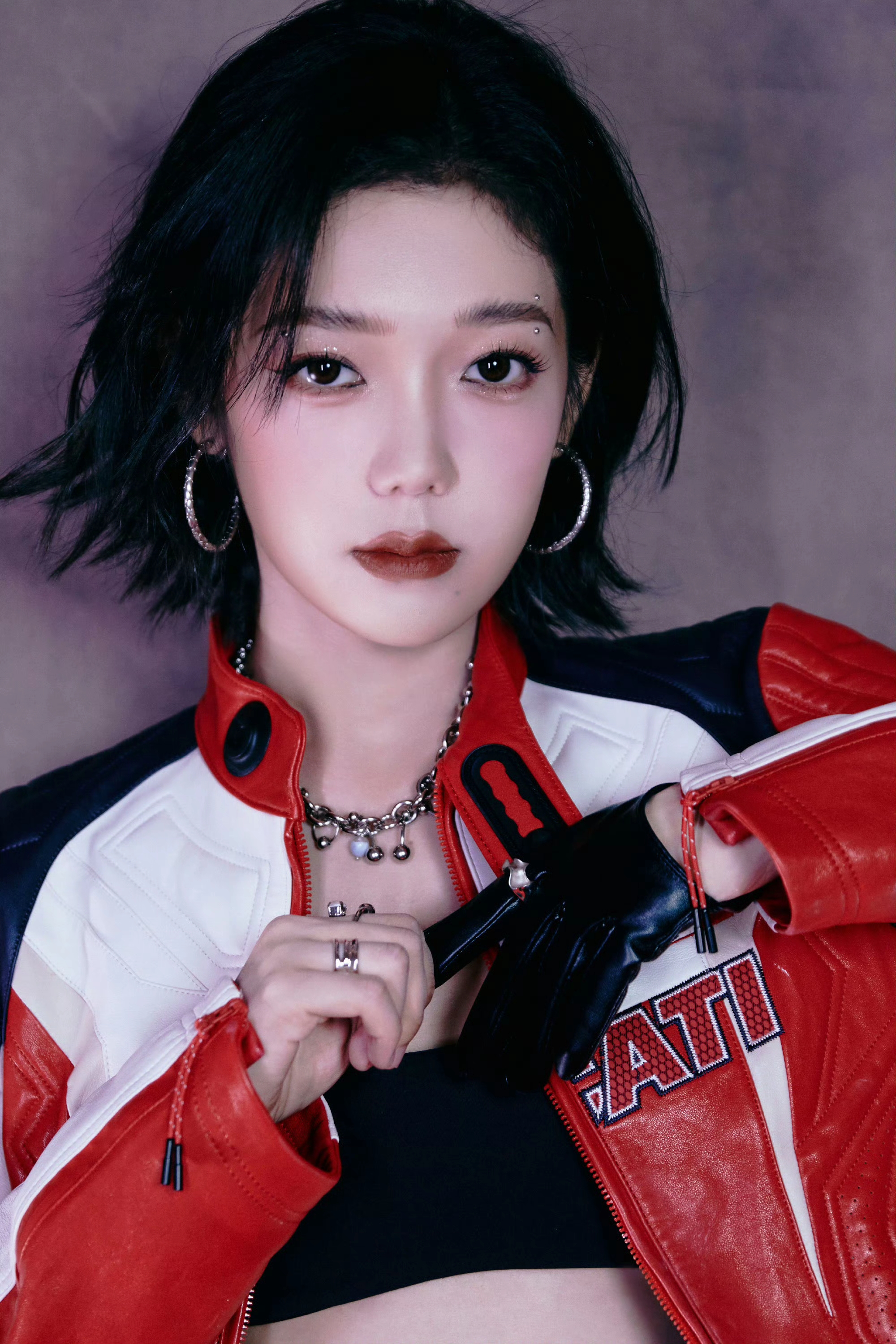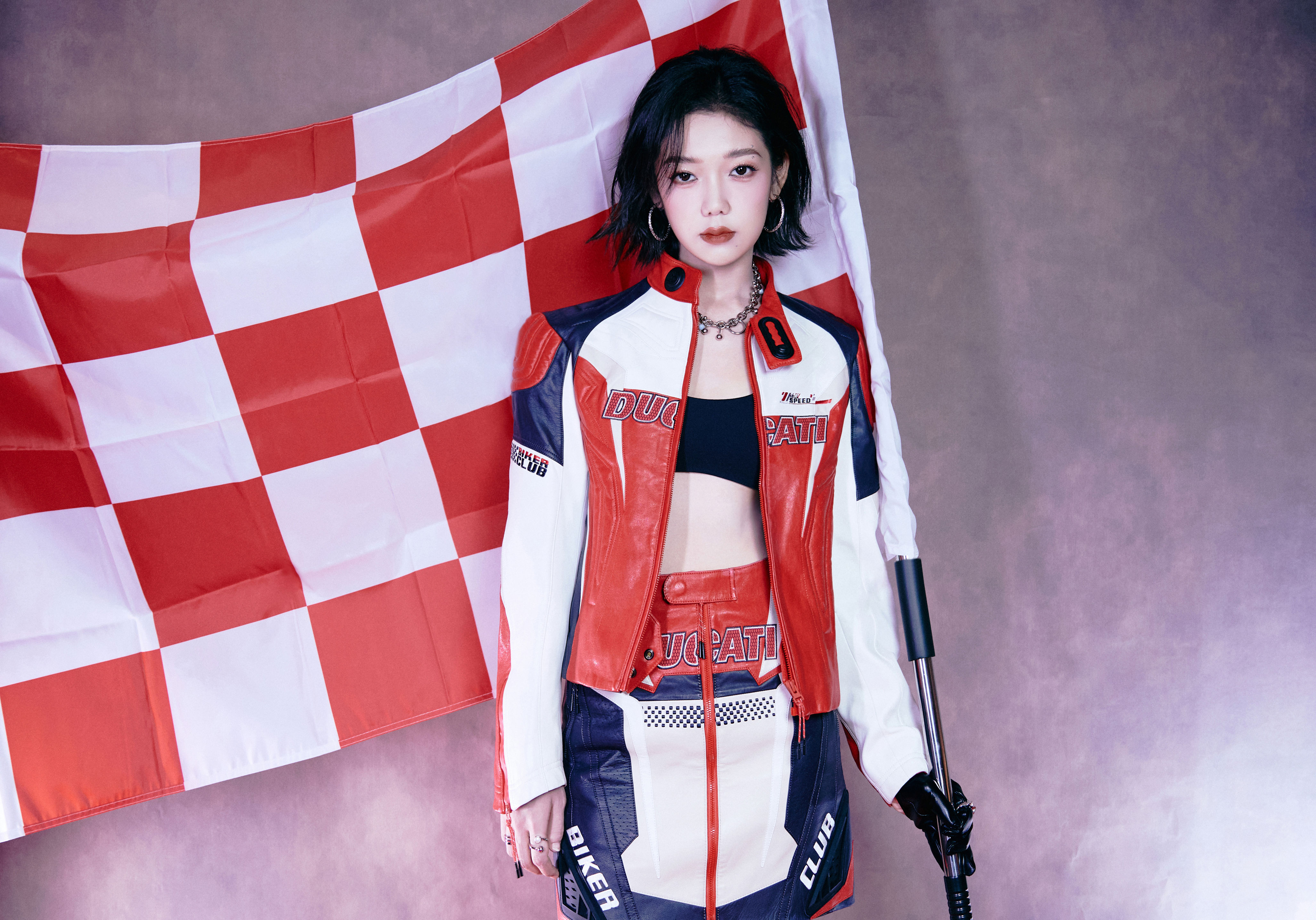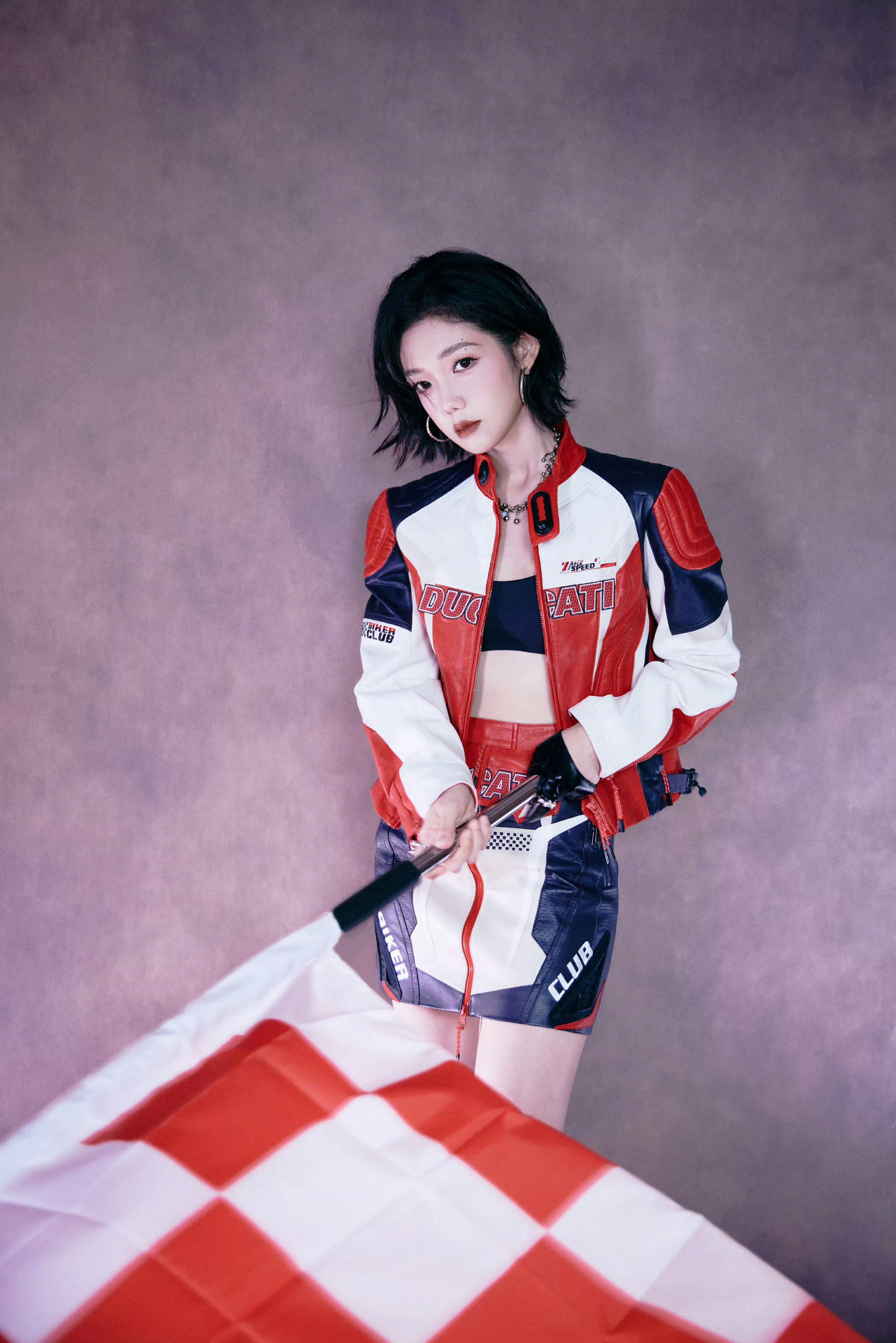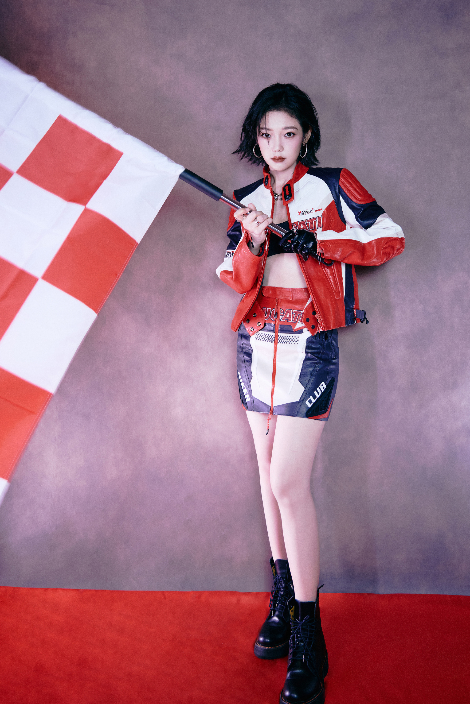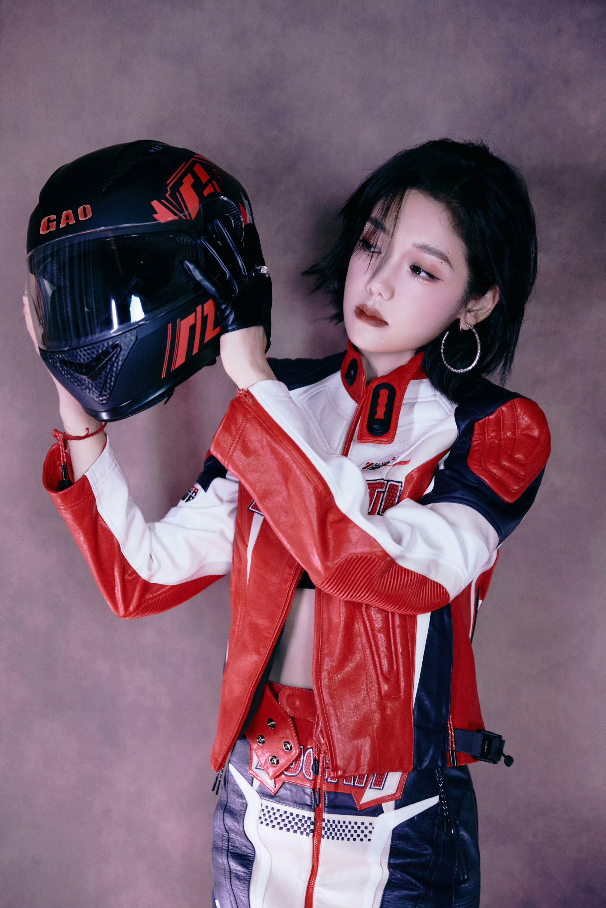 希林娜依高 红白黑撞色机车皮套装,以金属扣与品牌标识注入赛道基因,内搭运动bra露腰设计又添性感张力;金属链饰与厚底靴的加持,让每一步都踩在“酷飒与时尚”的平衡点上。 从棚拍镜头到live舞台,这套穿搭是