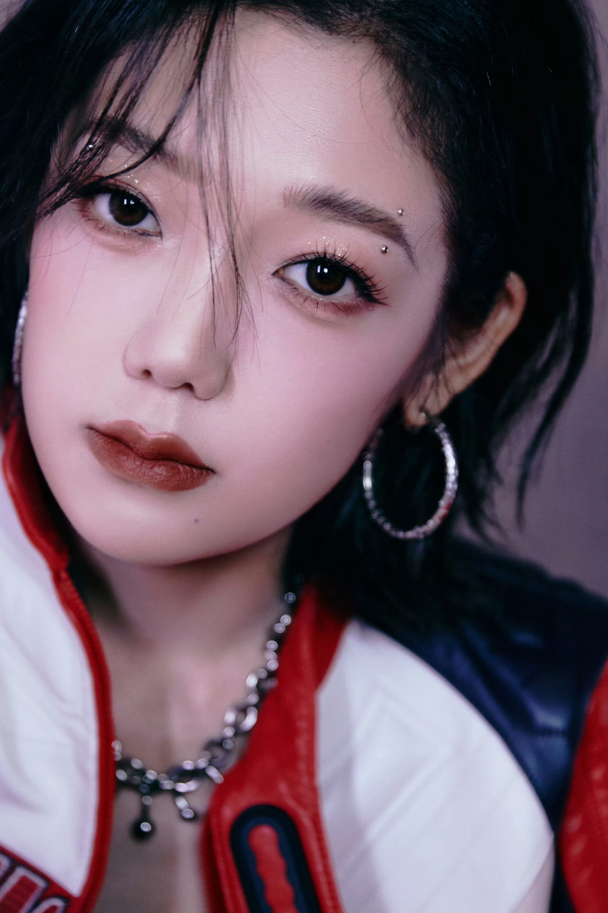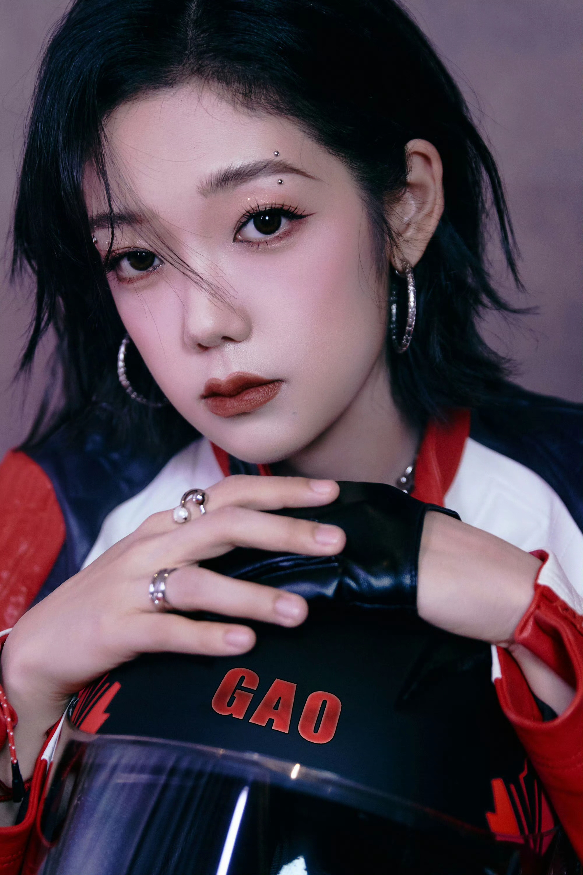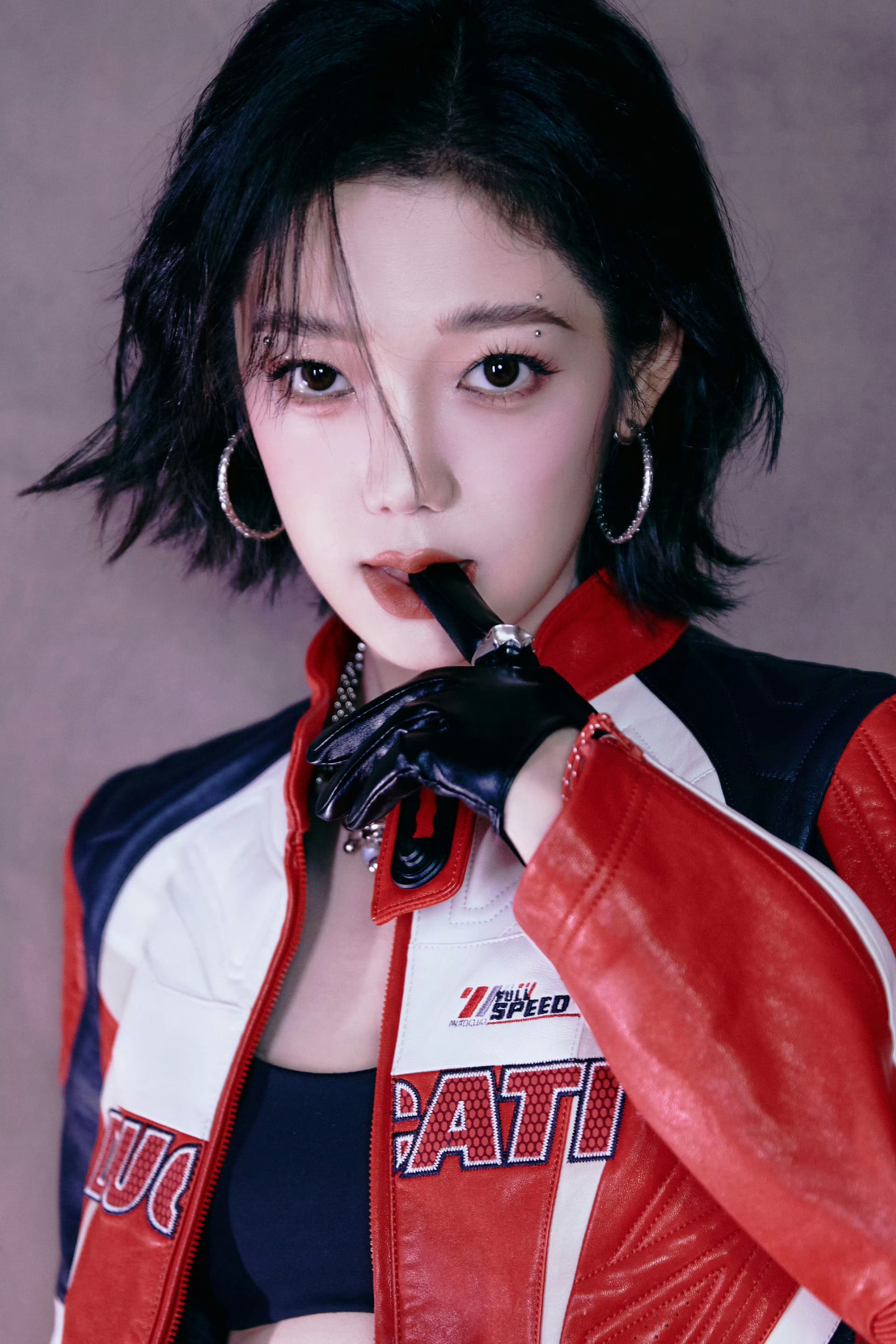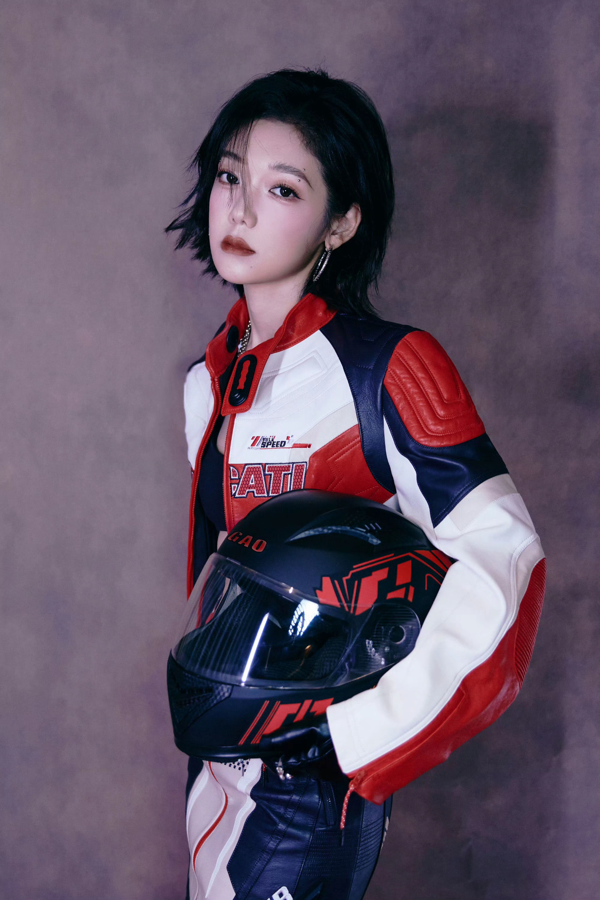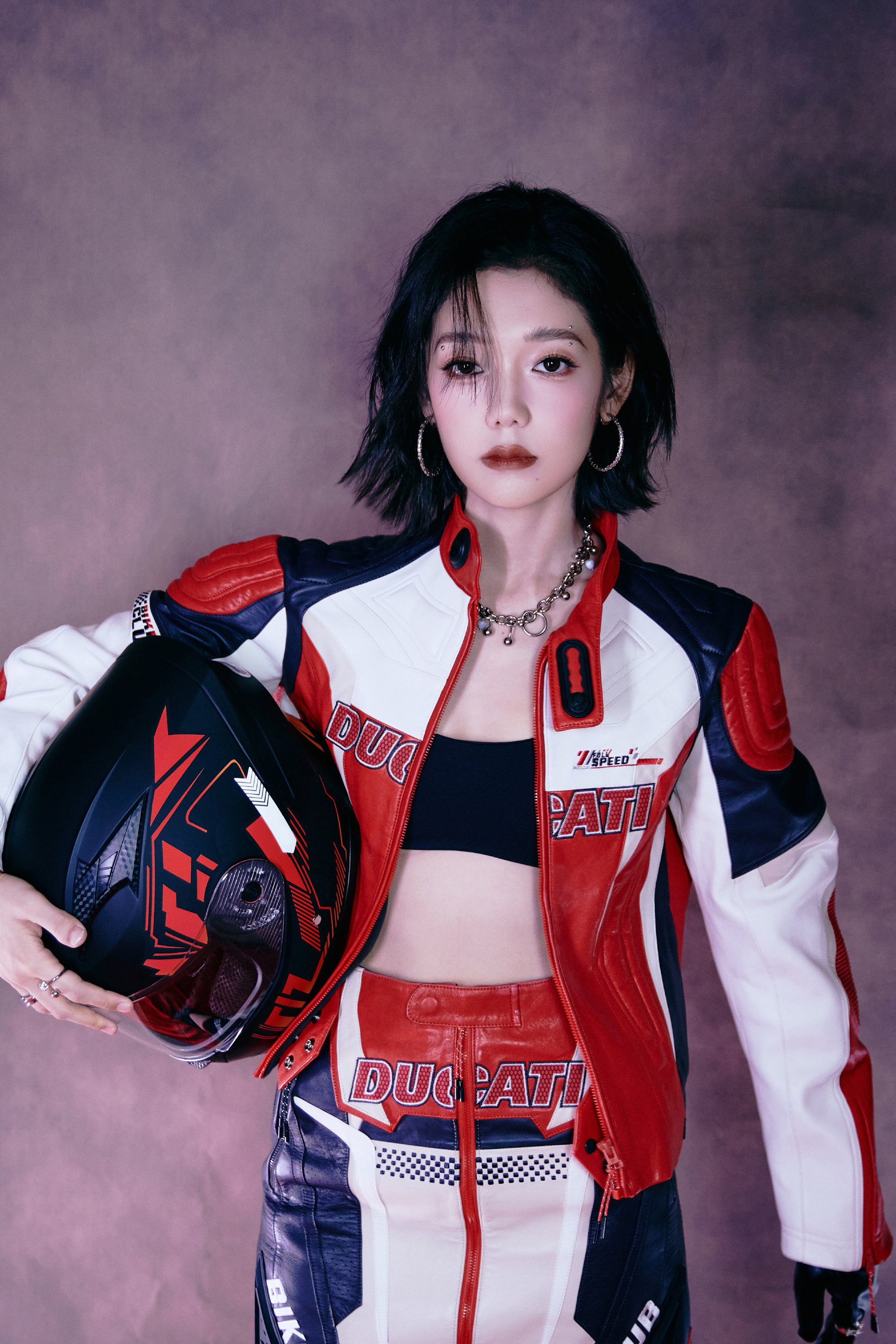 希林娜依高 红白黑撞色机车皮套装,以金属扣与品牌标识注入赛道基因,内搭运动bra露腰设计又添性感张力;金属链饰与厚底靴的加持,让每一步都踩在“酷飒与时尚”的平衡点上。 从棚拍镜头到live舞台,这套穿搭是