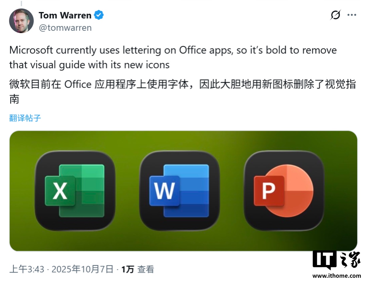 IT之家 10 月 7 日消息,科技媒体 The Verge 高级编辑汤姆・沃伦(Tom Warren)今天(10 月 7 日)在 X 平台发布推文,报道称 iOS 平台 TestFlight 版本 Excel、Word 和 PowerPoint 已启用新图标,并大胆地移除“X”、“W”和“P”字母标识,仅用颜色和形状区分不同 App。