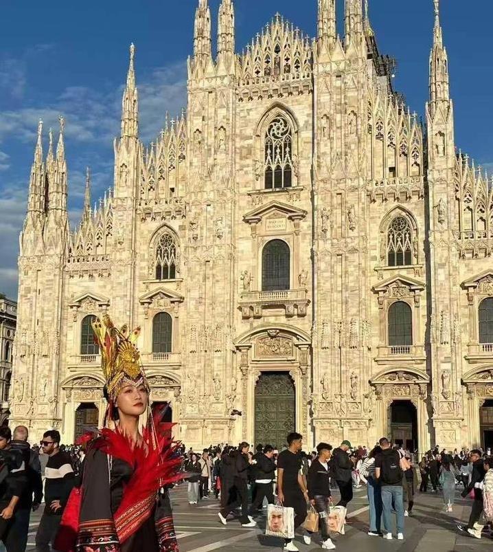 蓝盈莹的畲族身份让这场秀更有意义。她是浙江景宁人,2018年就创办了“畲艺工坊”,帮老乡卖手工艺品。她还拍过畲族“葵艺制作”视频,网上浏览量超400万。这次米兰之行,她用行动把畲族文化推向了全世界。