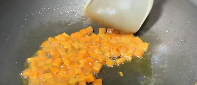 4、锅中放入几片生姜、一把青花椒,再淋上一勺花生油,开小火炸出香味,然后将生姜片、花椒捞出来,接着倒入胡萝卜丁,给它快速翻炒1分钟,炒好后,直接关火,放在锅中自然放凉。