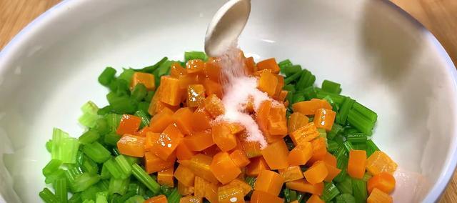 7、将晾凉的芹菜,给它改刀切成小丁,然后倒入大碗中,接着倒入胡萝卜丁,往里加入半勺食盐,用筷子给它充分地搅拌均匀,先放一旁腌制10分钟。