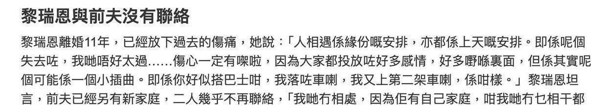 离婚对她来说,不是件容易的事。离开豪门,意味着要从头开始。她一个歌手,多少年没站在舞台上,复出能行吗?可黎瑞恩没被吓倒。她重新拿起麦克风,唱起了那些老歌。收入虽然不多,但够她和孩子生活。她说,忙碌的日子让她觉得踏实,慢慢地,离婚的伤痛也被时间抹平了。