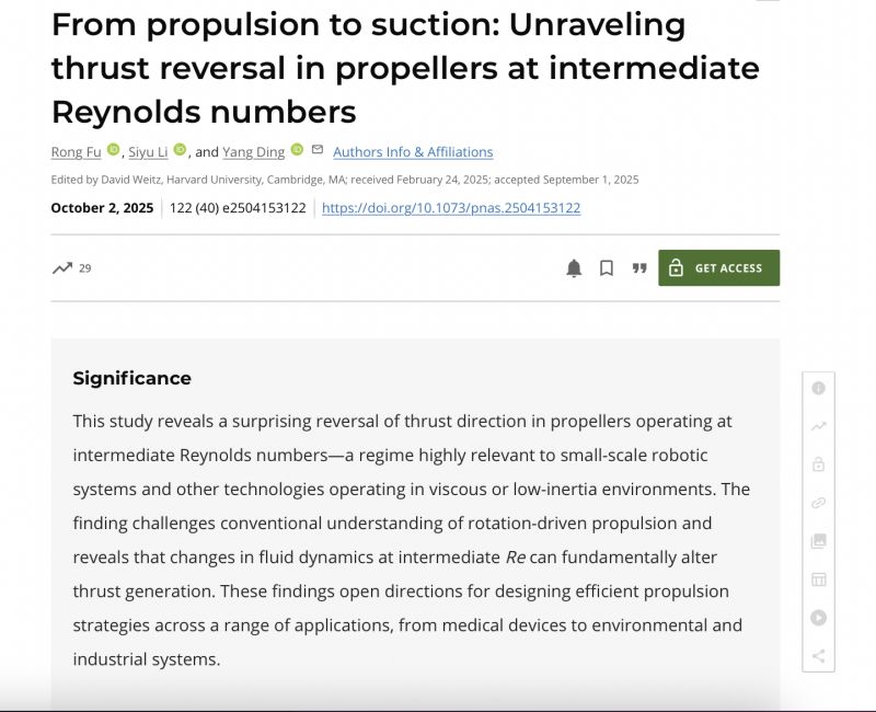 近日,北京邮电大学丁阳教授及团队在《美国国家科学院院刊》(PNAS)发表重磅成果,首次发现螺旋桨推进系统的“推进力反转”现象——特定场景下,无论螺旋桨正转、反转,物体均会后退。该发现突破传统推进流体