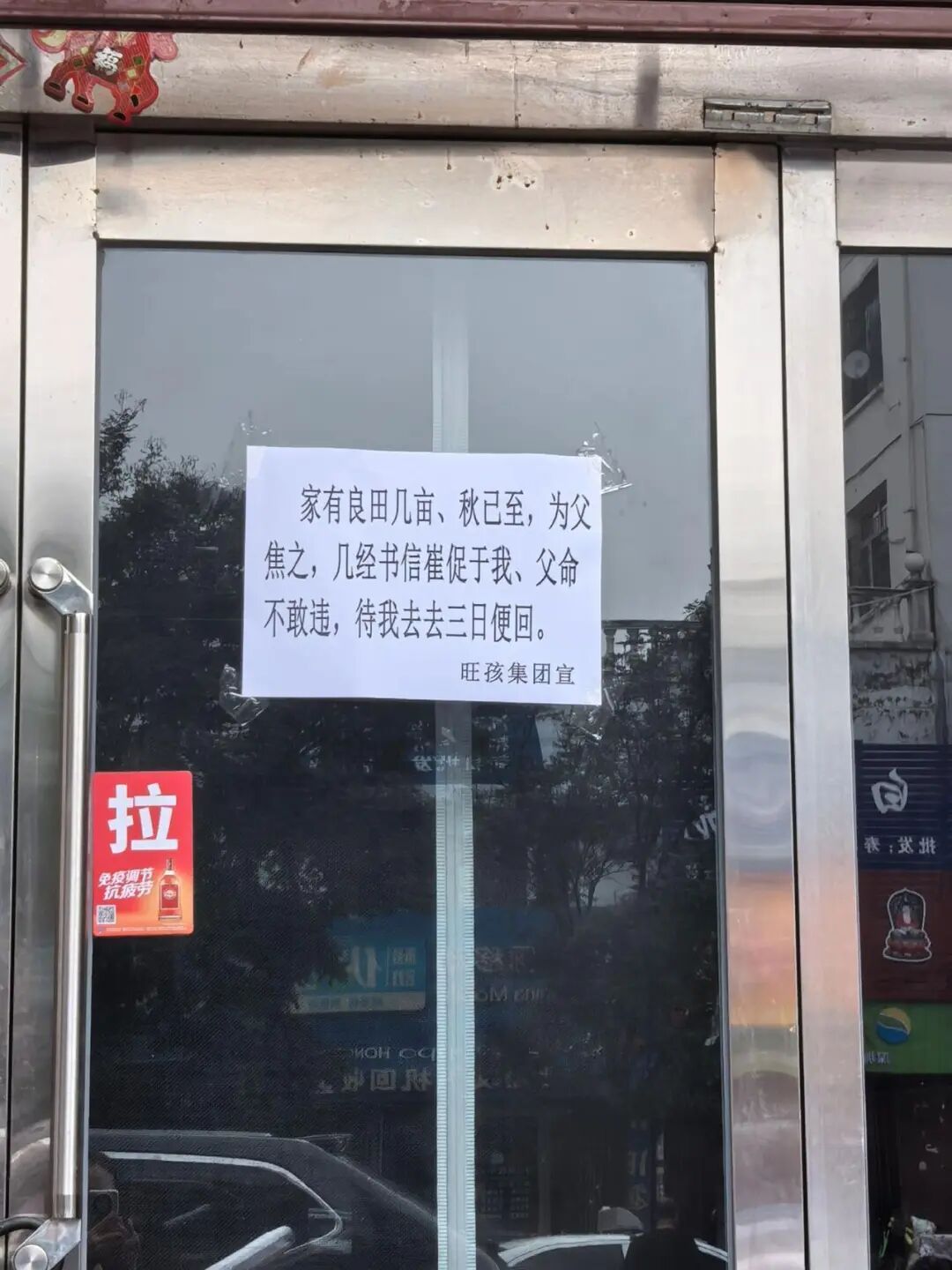 “家有良田几亩、秋已至,为父焦之,几经书信催促于我,父命不敢违,待我去去三日便回。”边女士把这张请假条发到网上之后,引起网友热议,还有游客专门去“探店”。很多网友说,国庆假期人人都抢着做生意,这位老板却“反向操作”,关门歇业回老家秋收,真是一个大孝子,老板生意一定很好。