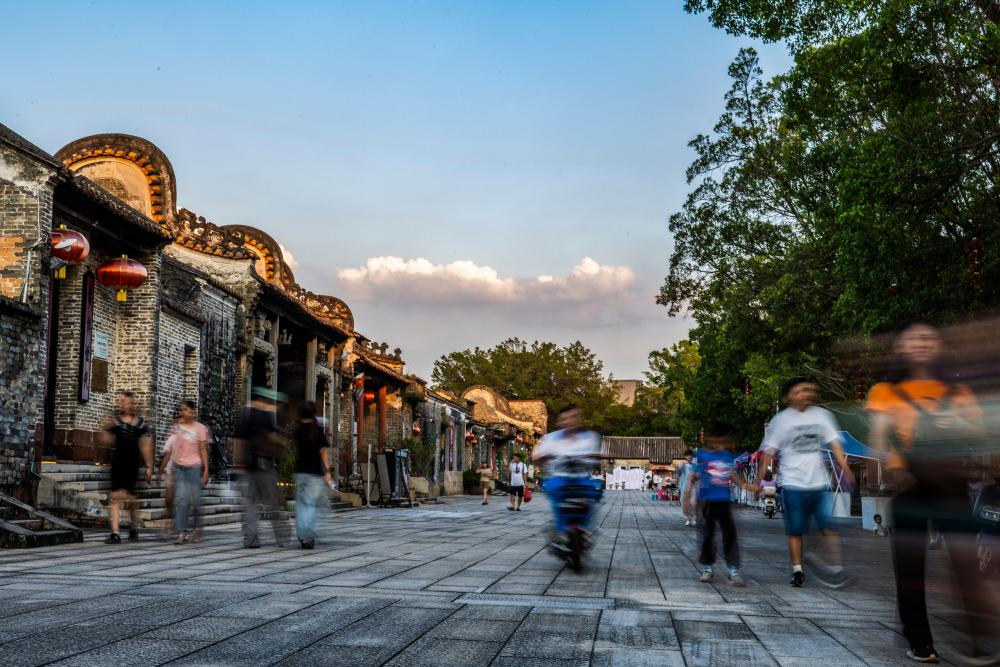 9月13日,孩子们骑车经过塱头村的升平人瑞牌坊。画面中部远处白色建筑是春阳台艺文中心。