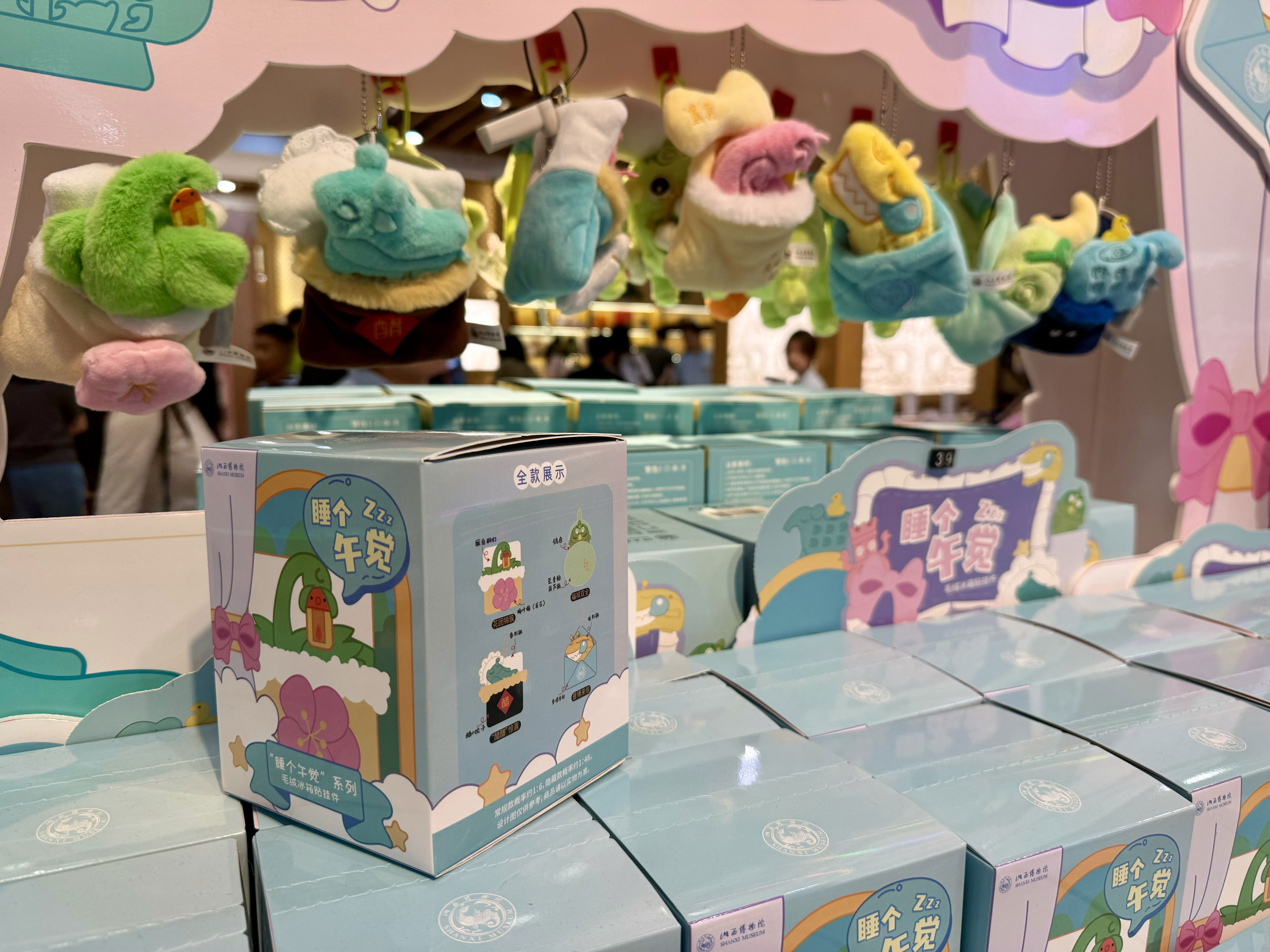 文创成“顶流”,文物也可以“好玩”。节庆期间,山西博物院的“睡个午觉”系列盲盒成为爆款,将镇馆之宝晋侯鸟尊与明代金锭文物巧妙结合,让文物在睡袋中“午休”的创意令人会心一笑。“网上都说山西人爱午睡,于是我们就研发出了这款文创产品。”山西博物院院属晋观公司副总经理吕婧解释道。