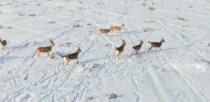 当西伯利亚寒风一吹,蒙古国的气温,立马跌至零下30到40度。有些区域,甚至会跌破零下50度的警戒线。在这种情况下,黄羊们的日子就不太好过了。