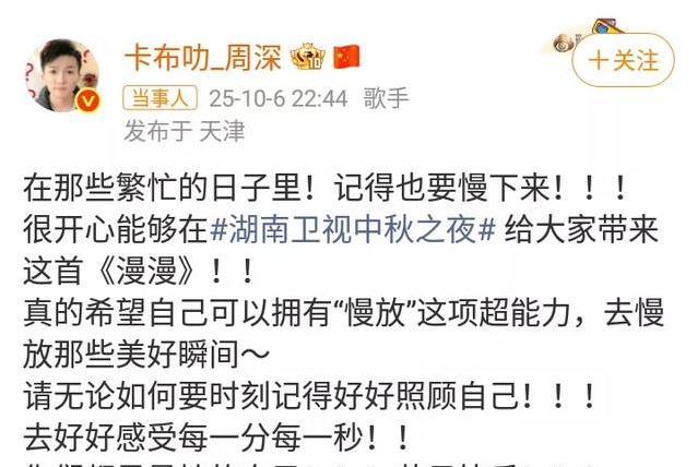 周深还在社交平台上发了条感性的动态,说自己忙归忙,但也希望能“慢下来”,好好珍惜那些美好瞬间。他还提醒大家要照顾好自己,感受生活的每分每秒。这话听着就像老朋友在聊天,暖心又接地气。