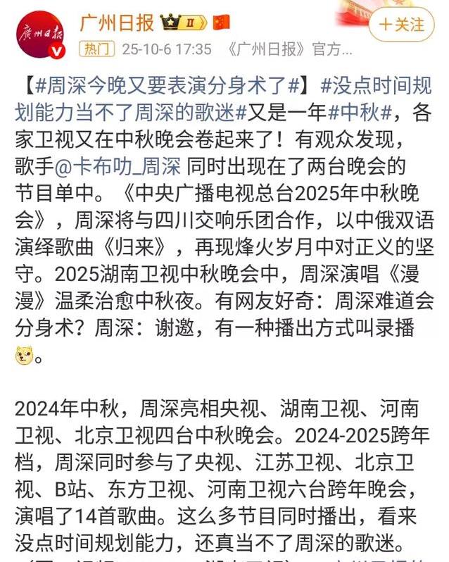 其实,这也不是周深第一次这么“忙”。去年中秋,他可是同时出现在央视、湖南卫视、河南卫视和北京卫视四场晚会上!这操作,简直是艺人界的“时间管理教科书”。网友都调侃,他是不是偷偷练了什么“分身大法”?