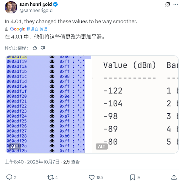 他通过固件分析发现,苹果只是修改了一个用于转换信号强度与显示格数之间对应关系的“查找表”(lookup table),这个修改仅涉及20个字节的数据。
