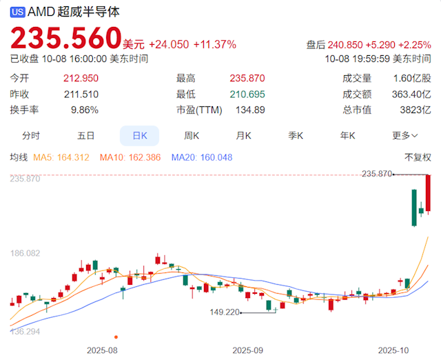 据悉,9日收盘,AMD股价上扬11.37%、收235.56美元,并创历史收盘新高,本周迄今已飙涨43.05%,推动AMD市值来到3823亿美元。