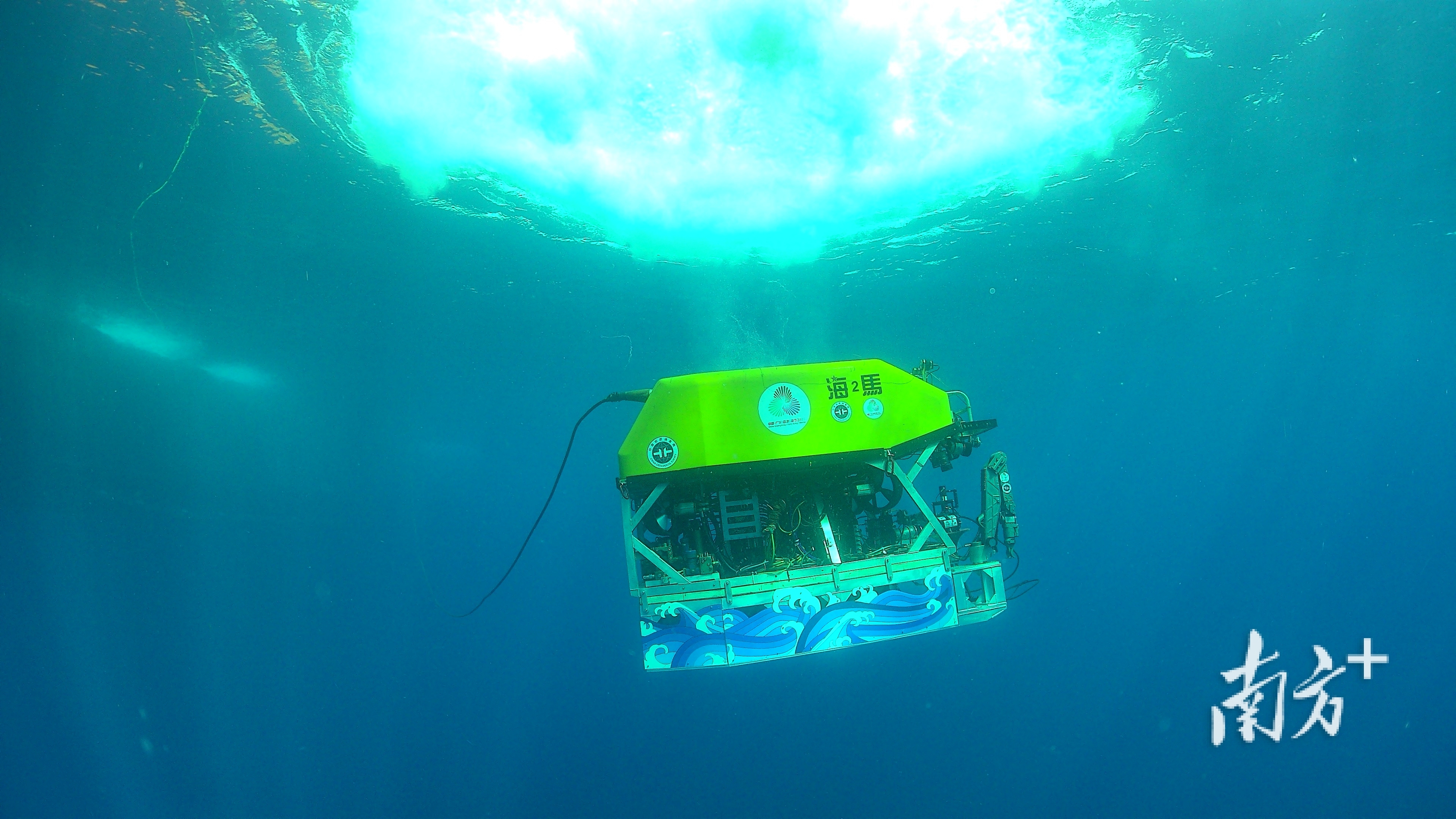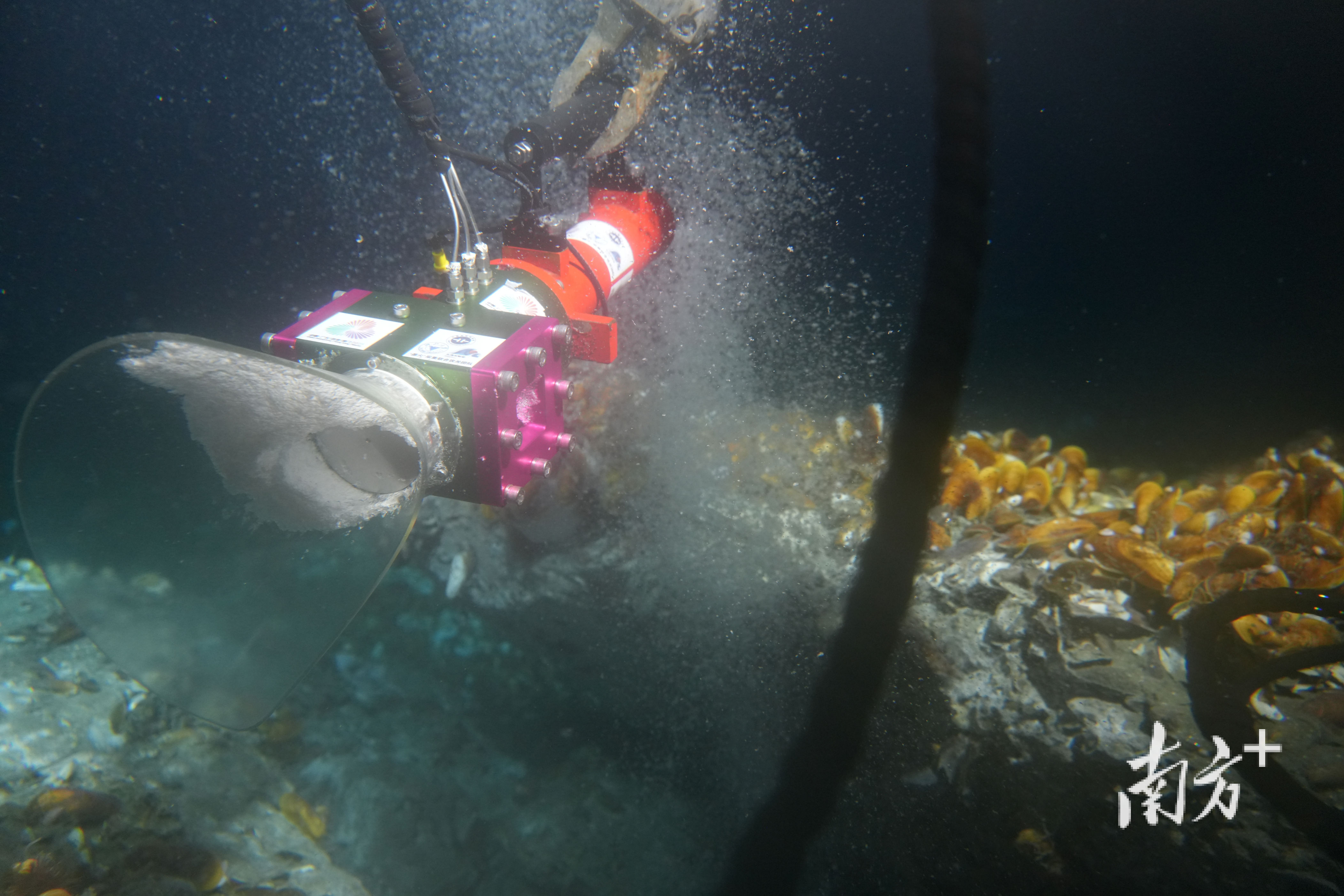 “‘源火’采集要走四步关键流程。”广州海洋地质调查局方法所副所长陈宗恒向南方+记者拆解:先在冷泉口采可燃冰及伴生气,降压分解出甲烷;再用科考船光伏发电转化的电能,远程到海底引燃甲烷;最后由“海马”号无人潜水器带“源火”回甲板,移入源火盒保存。