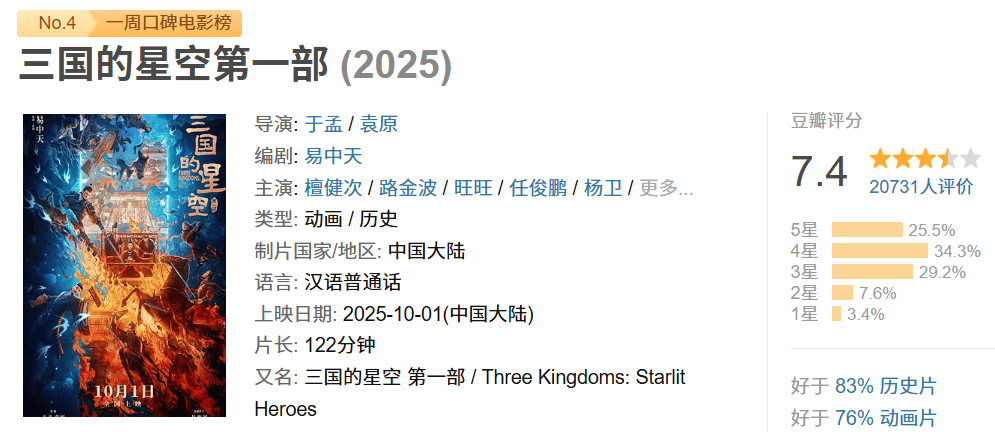 该片目前在豆瓣评分7.4,好于83%的历史片和76%的动画片。这个评分相对中肯,至少在上映首日即开分,做到了公开公正。
