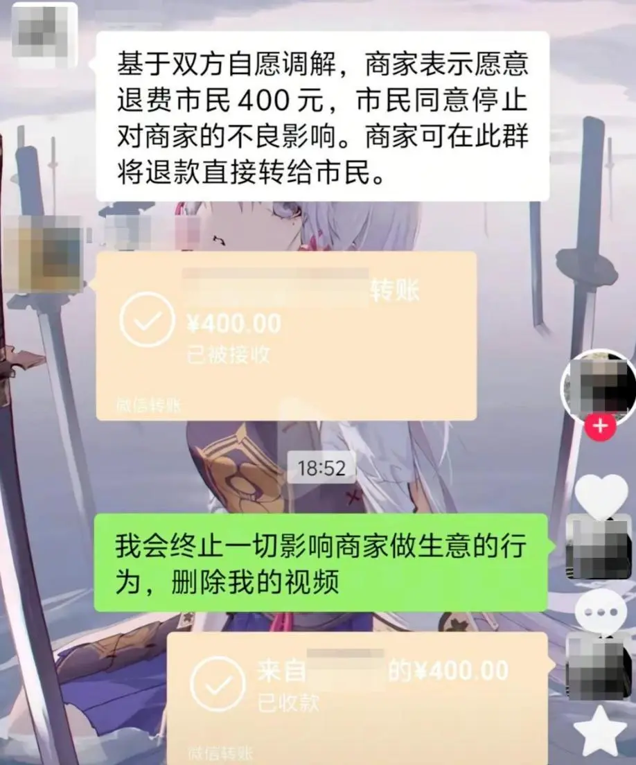 最终,杨先生收到了400元退款补偿,并删除了原始视频内容。