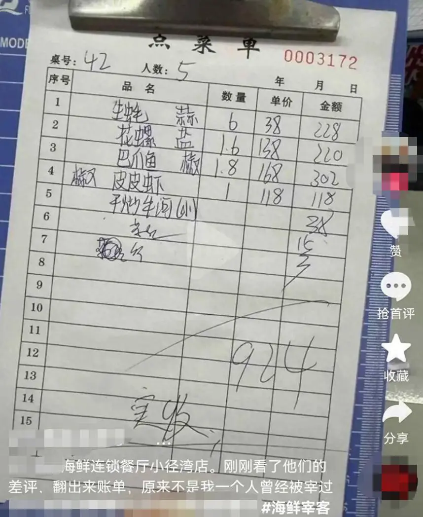 网友陆续晒出过往在同一家店的消费账单,不少人点了三四个海鲜菜品,账单轻松过千,生蚝单价高达38元,蟹类甚至喊价288元一斤。