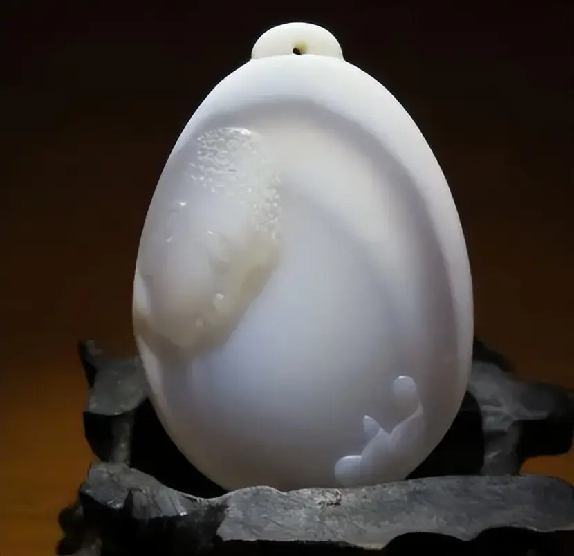 小鸡出壳的由来:这块玛瑙看起来像一只淡黄色的小鸡,啄破蛋壳后正探头往外看,留半个身子在蛋壳中,色彩艳丽,栩栩如生。