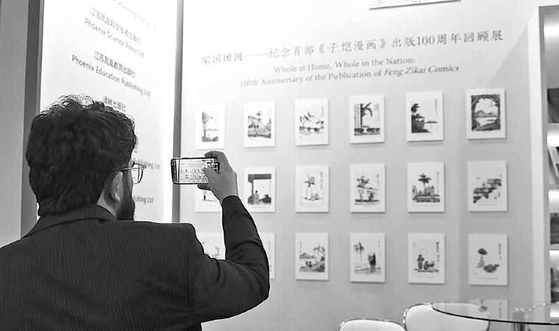 为参观者在中国展台拍摄纪念首部《子恺漫画》出版100周年回顾展。