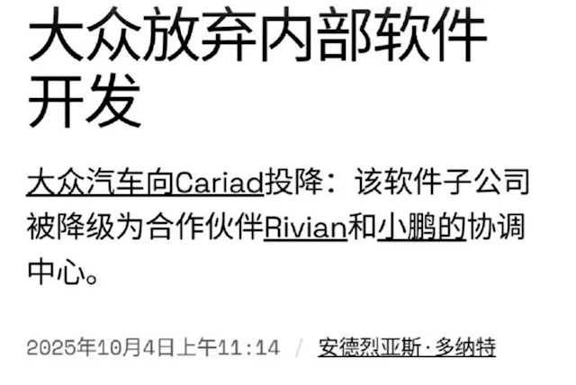 10月9日快科技消息,近日,据外媒报道,大众汽车集团正式宣布一项重大战略调整:彻底放弃软件自研路线,并将其旗下软件子公司CARIAD的定位,从“核心开发者”降级为“合作伙伴协调者”。