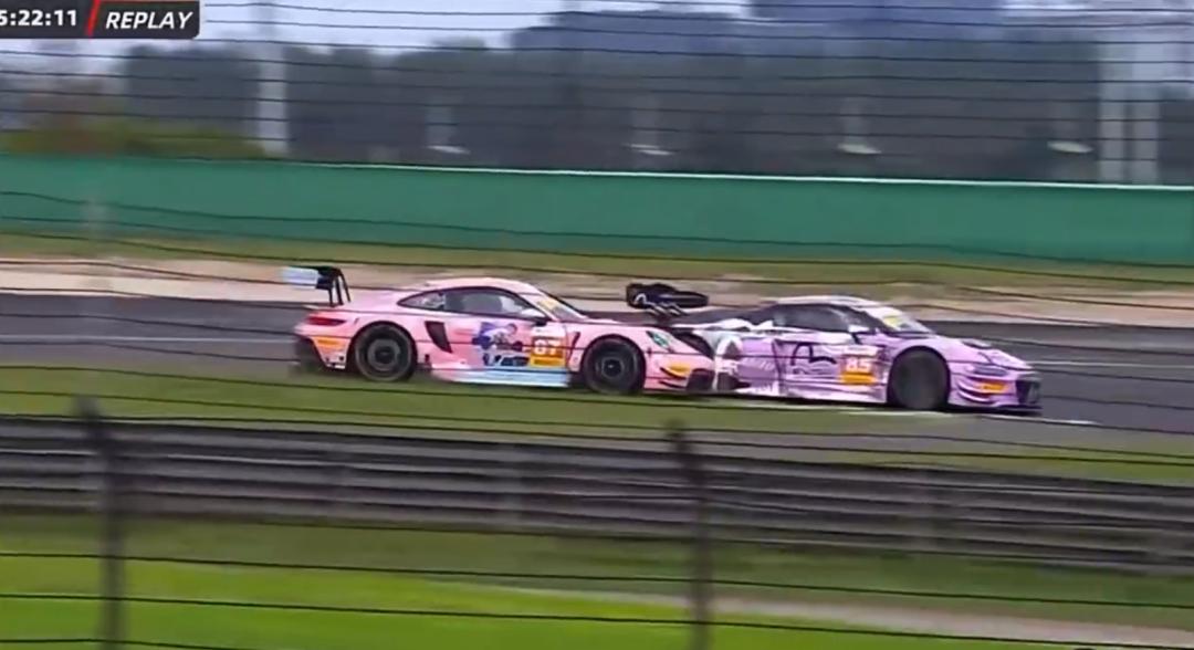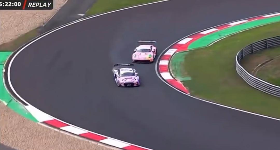视频显示,85号赛车右后轮胎与87号赛车轮毂产生剐蹭,碰撞造成赛车右后轮拱及扩散器受损,车胎与车身部件摩擦产生高温随即冒烟。