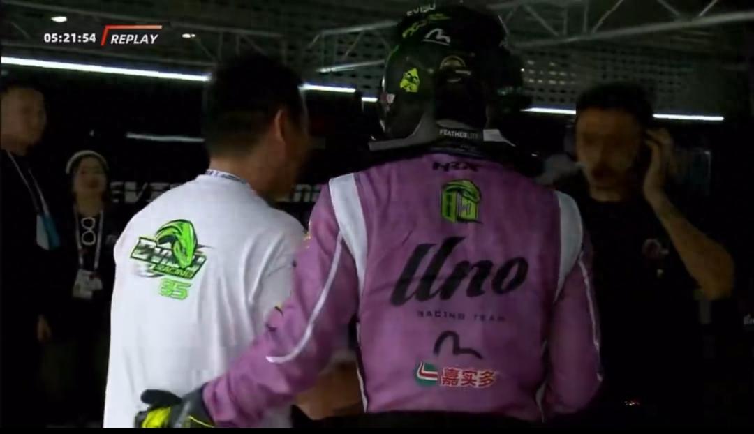 10月8号,上海8小时耐力赛中,车手王一博驾驶85号赛车,虽遭遇小事故但仍平安完成本段驾驶走出驾驶舱,王一博与队友教练温暖互动。比赛解说表示王一博这么短时间训练,在比赛中完成度很高。