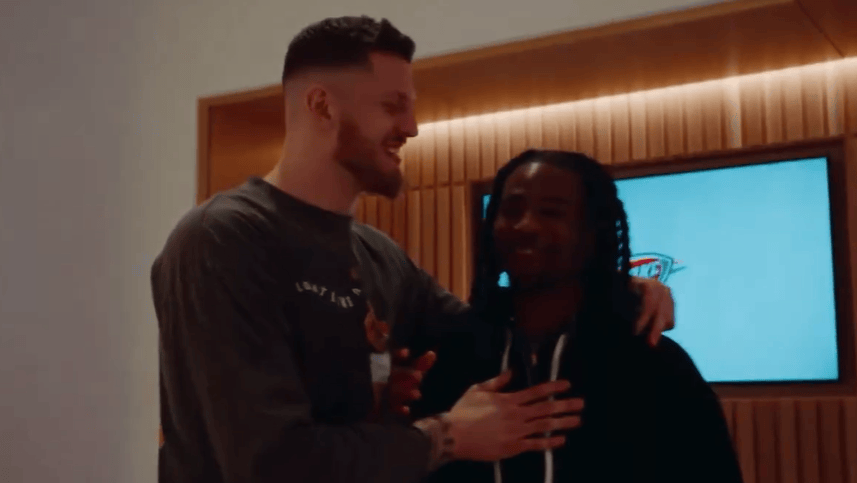 虎扑10月10日讯 今日,雷霆球员以赛亚-哈尔滕施泰因更新社媒,晒出了一段纪录片。纪录片中自己与队友卡森-华莱士开玩笑