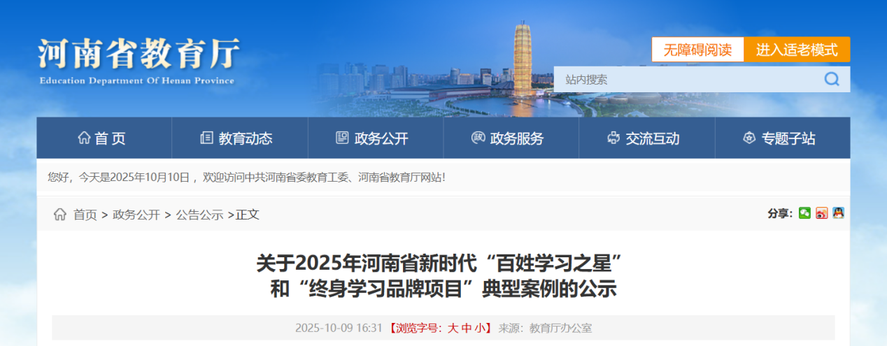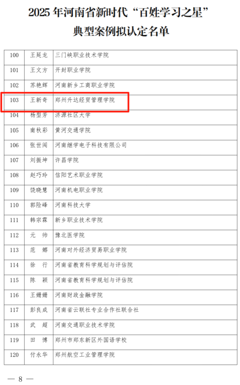 近日,河南省教育厅公布2025年新时代“百姓学习之星”与“终身学习品牌项目”评选结果。由郑州升达经贸管理学院继续教育学院组织申报的两项案例均通过评选:郑州升达经贸管理学院董事长王新奇博士荣获“百姓学